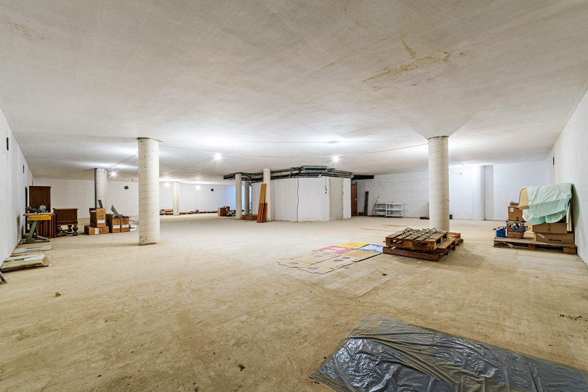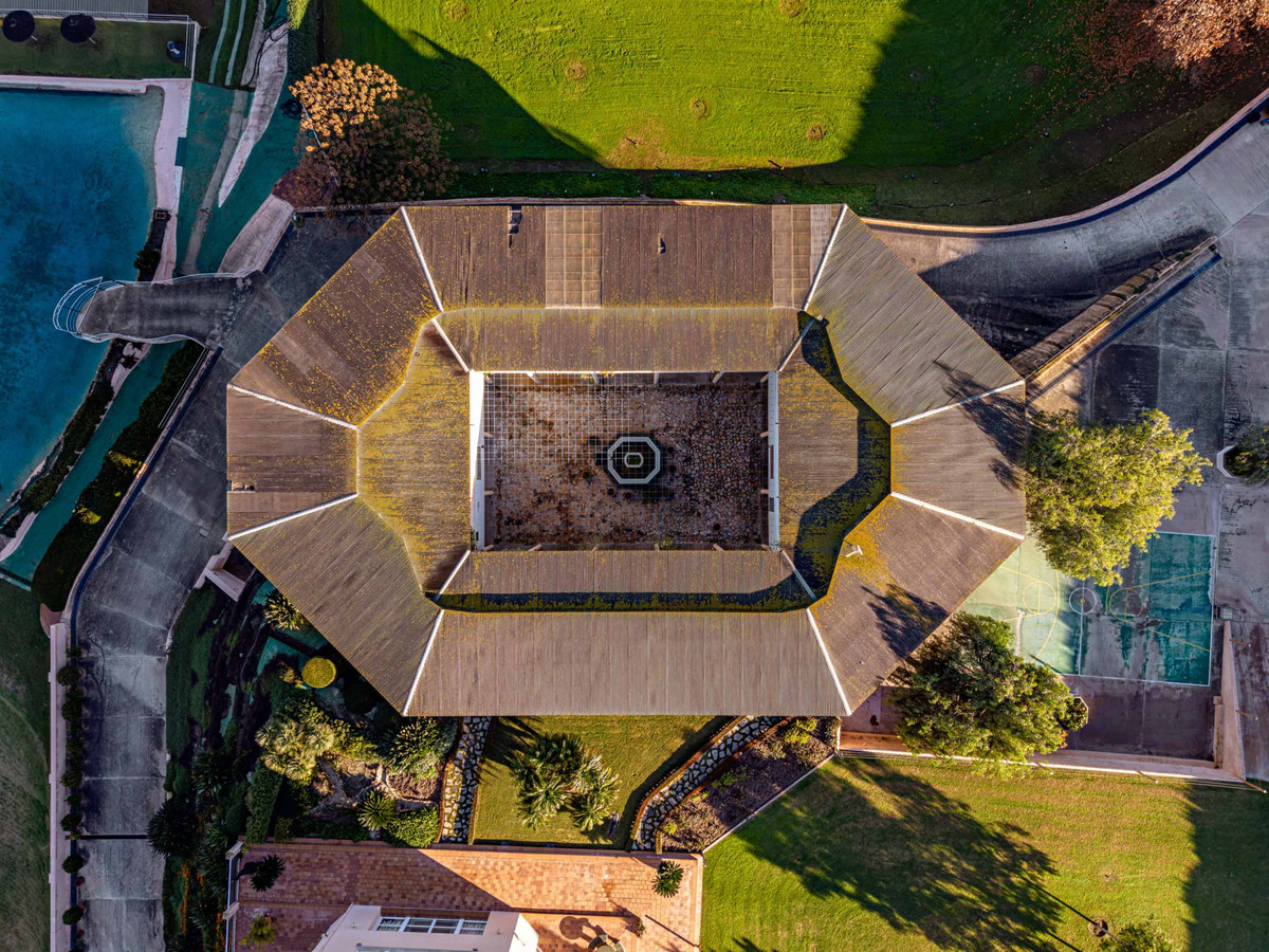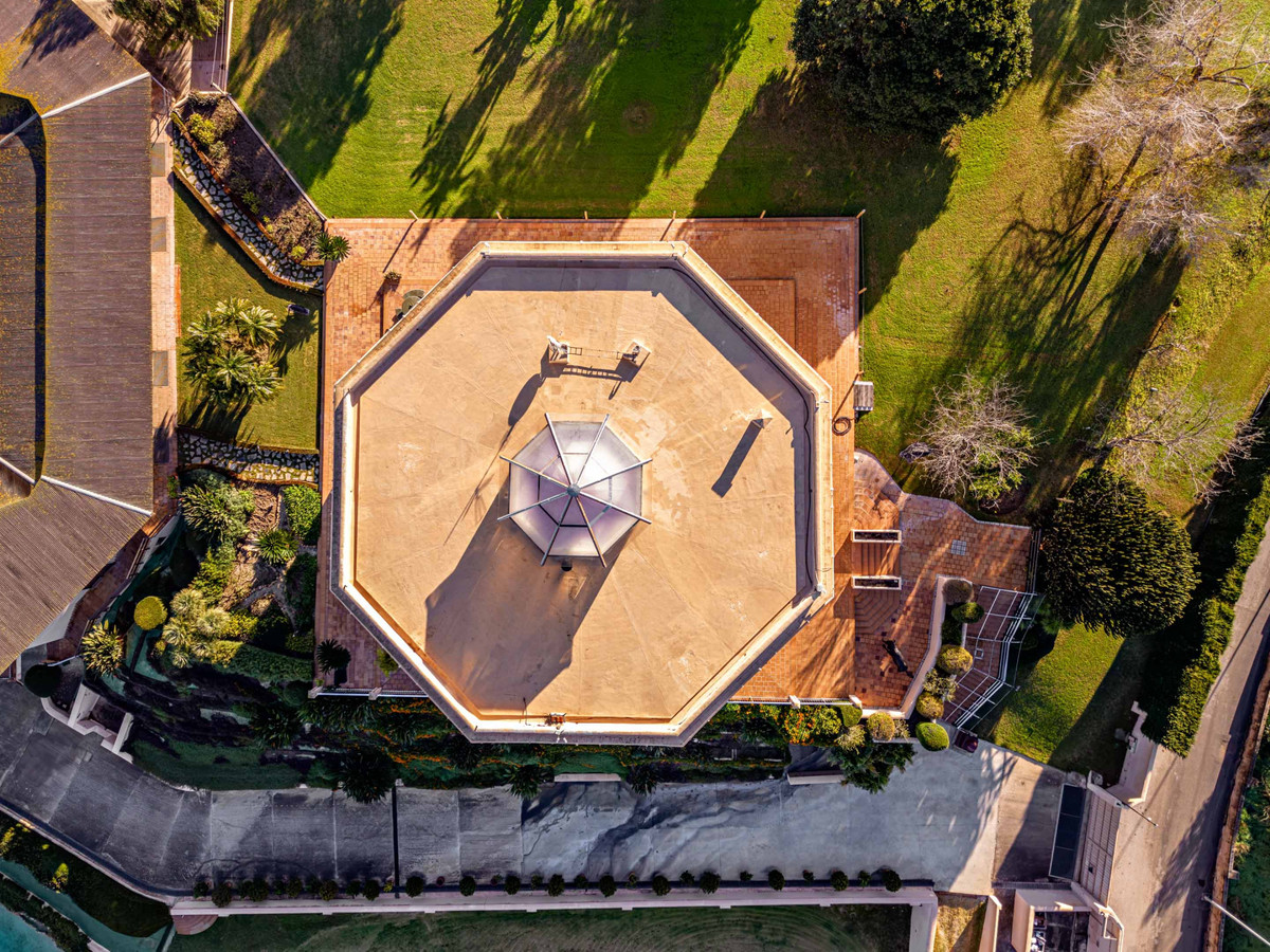 The estate comprises two distinctive octagonal buildings. The main residence, with 2,058 m² of built area, is arranged over several floors connected by staircases and elevators, offering generous spaces designed for both residential and professional use. The ground floor features a social lounge, reception area, guest WC, staircases, lift and a pleasant covered porch. The upper floor includes guest rooms, bathrooms, offices, private offices, a library, meeting room, exhibition areas, and the corresponding corridors and lifts. The dwelling also has two basement levels used for storage rooms, lobbies, bathrooms, service areas and facilities, plus an additional garage basement with mezzanine, providing excellent storage capacity and functionality.