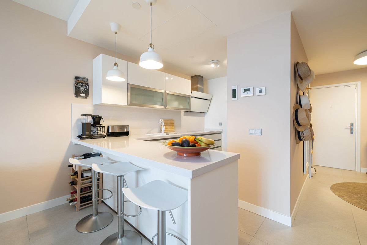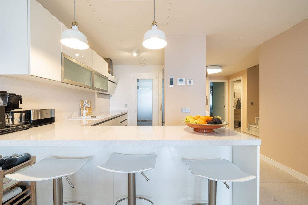 The apartment is distributed over two levels and comprises three spacious bedrooms and three well-appointed bathrooms. All bedrooms include integrated wardrobes. The lower level features an open-concept living area and a highly functional kitchen, allowing you to prepare meals while overlooking the sea. A practical utility room is located discreetly at the rear of the kitchen. The home's convenience is further enhanced by a comprehensive water purification system that protects the lifespan of the appliances, complemented by an additional filtration system for pure drinking water.