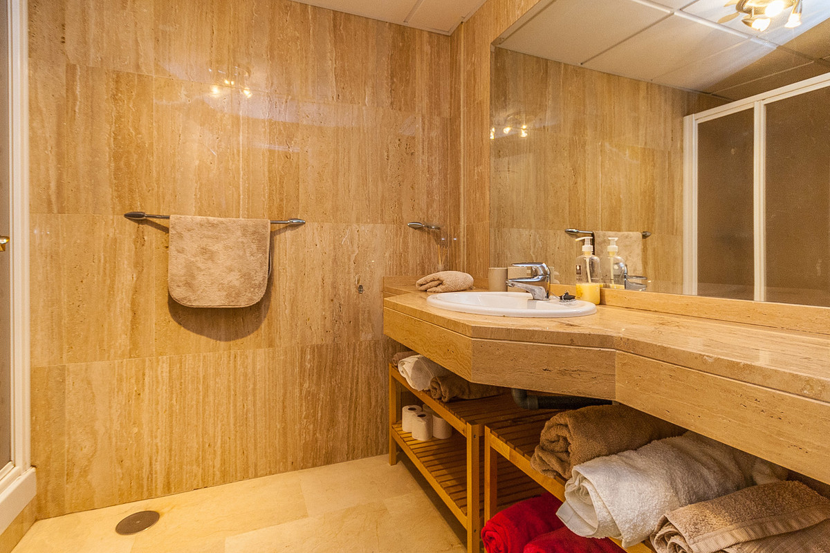 Bright and sunny ground floor apartment in the sought after community of Los Jardines, just around the corner of the 18-hole Santa Maria Golf Course. The community is fully gated and offers 4 outdoor swimming pools surrounded by landscaped gardens, 24-hour security and underground (private) parking spaces and storage rooms. The apartment is south facing and consists of two bedrooms with two bathrooms, a fully fitted kitchen with all appliances and a utility room, an ample lounge/dining area and a sunny terrace with direct garden access. Walking distance to local shops, restaurants, supermarkets and the beach!