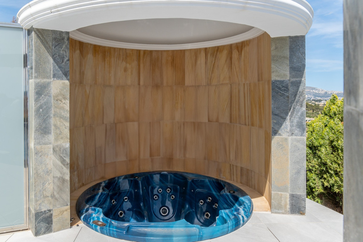 Experience refined Mediterranean living in this stunning luxury villa on the prestigious Benissa Coast, offering breathtaking sea views, expansive terraces and top-of-the-range amenities.Accessed via a gated driveway with private parking for two cars, the property opens onto an impressive outdoor living area. Here you will find a beautiful swimming pool, a relaxing jacuzzi, a fully equipped outdoor kitchen with barbecue, guest toilet and outdoor shower—perfect for seamless indoor-outdoor living. The villa is also equipped with solar panels, ensuring energy efficiency.Inside, the villa boasts a bright and spacious living environment with two generous lounges, one featuring a cosy wood-burning stove that creates a warm and inviting atmosphere. The modern kitchen is fully equipped with Bosch appliances, a central work island and sliding doors for added privacy, and connects directly to a practical utility room. The open-plan dining area enjoys spectacular sea views and direct access to the terrace through large sliding doors.The lower level further comprises a separate bathroom, a guest bedroom with terrace access, and a luxurious master suite complete with a dressing room and an en-suite bathroom featuring a walk-in shower and spa bath.The upper floor hosts two exceptional master bedrooms, each offering a king-size bed, en-suite bathroom, dressing room and direct access to large private terraces. From here, panoramic views stretch across the Mediterranean Sea, surrounding mountains and the iconic Peñón de Ifach.Surrounded by four spacious terraces, this exceptional villa provides the perfect setting for relaxation, privacy and elegant outdoor living.