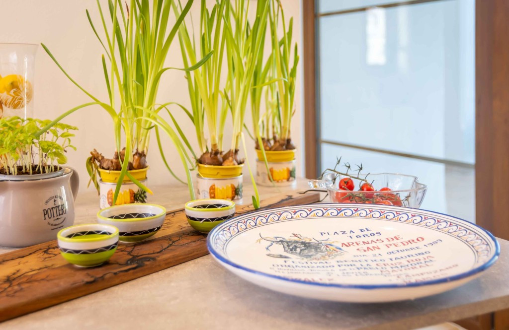 The entrance floor of the villa is comprised of a fully equipped kitchen and a bright and spacious living area, that leads seamlessly to the outdoor dining terrace, private garden and pool area. The outdoor area offers ample space for dining, relaxation and entertainment in a tranquil and private setting.