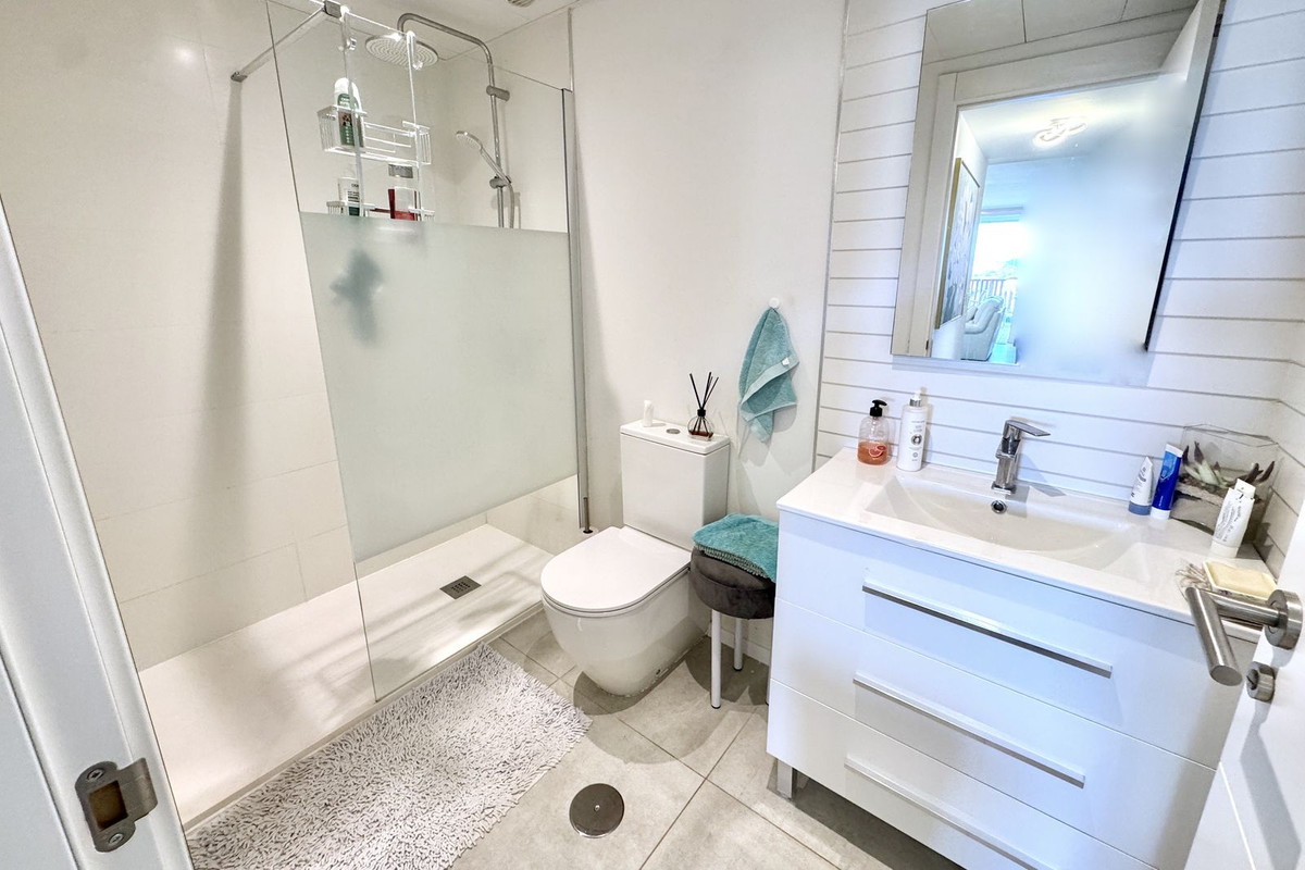 Denne moderne luksuslejlighed tilbyder; rummelig stue/spisestue med stort åbent moderne hvidt højglans køkken. Med indbygget ovn, kogeplader, emhætte, køleskab, fryser, mikrobølgeovn. 3 store dobbeltværelser med indbyggede skabe, Master med terrassedøre til terrasse, walk-in garderobe og luksuriøst ensuite brusebadeværelse. Plus et 2. familiebrusebadeværelse. Overdækket terrasse (nu med glasgardiner) og privat have med udsigt over bebyggelsen med bjergbaggrund og delvis havudsigt. Varm og kold aircondition, privat parkeringsplads og opbevaringsrum. Interiøret har et smukt tidløst design med finish af høj kvalitet og neutrale farvepaletter.