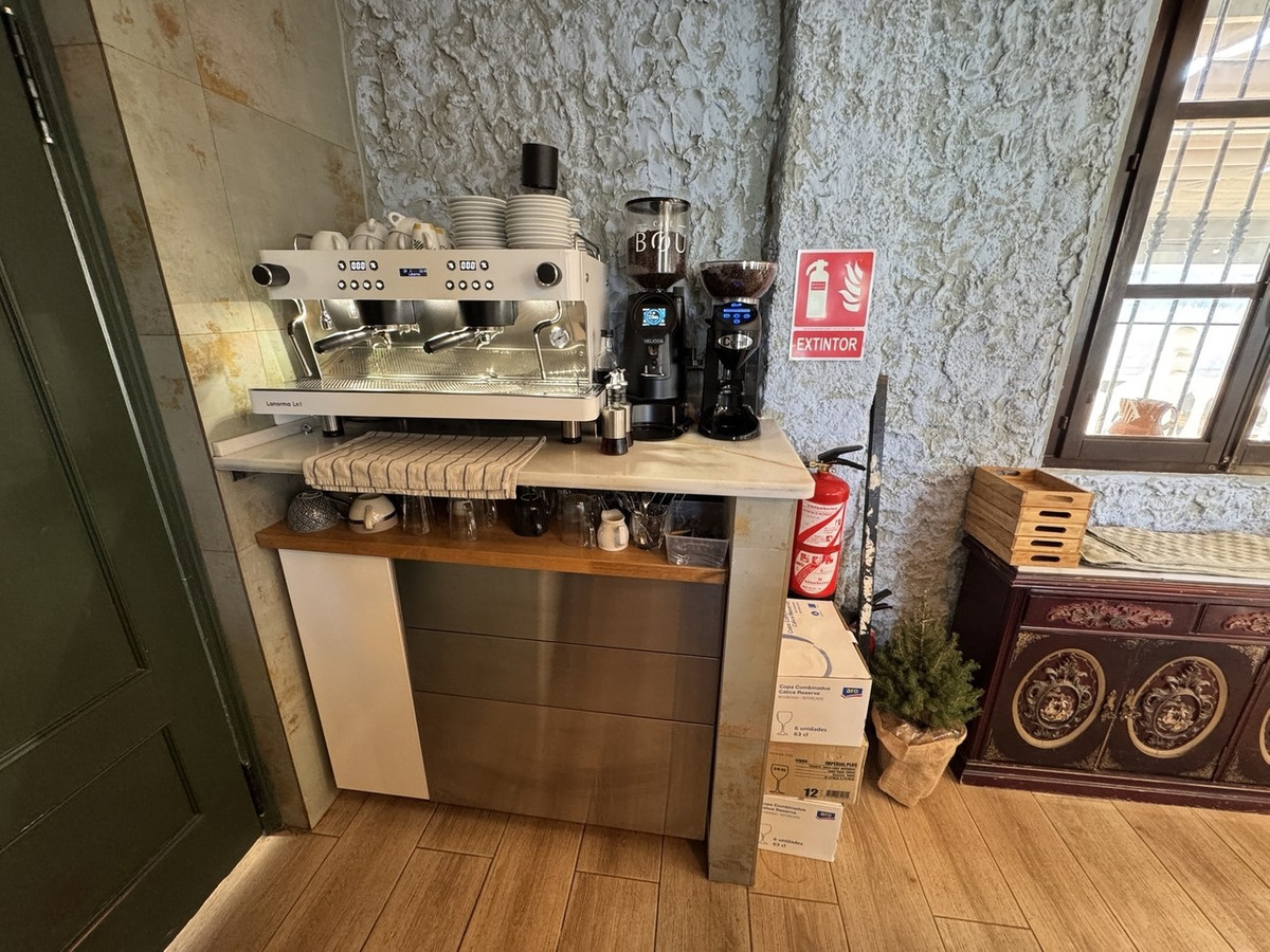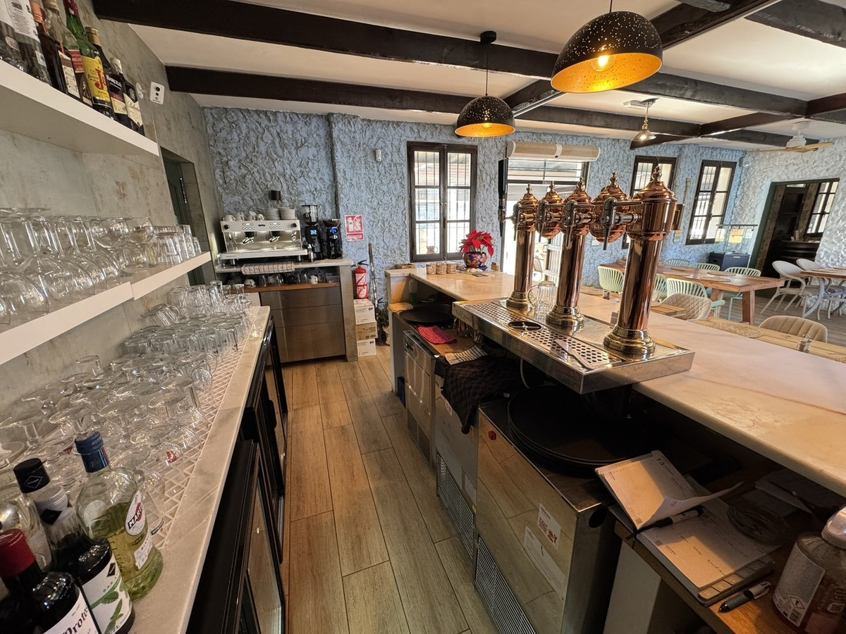 Inside, the restaurant offers seating for 28 diners and features a beautiful, homely décor. A decorative fireplace creates a welcoming focal point alongside the bar area, which is equipped with fridges, beer pumps, an ice maker, and a dedicated coffee station.