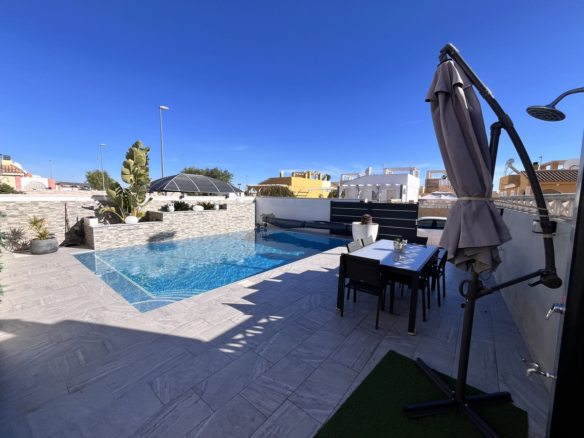 The property features a private swimming pool, a fully renovated terrace, and a furnished solarium, perfect for enjoying the climate and relaxing outdoors.