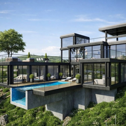 Denne moderne villa er mere end et hjem – det er en oplevelse. Et minimalistisk arkitektonisk mesterværk, der integreres perfekt i skråningen og kombinerer rene linjer, ædle materialer og tidløs elegance.