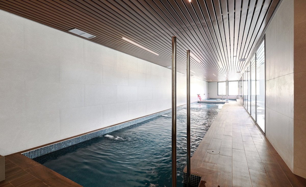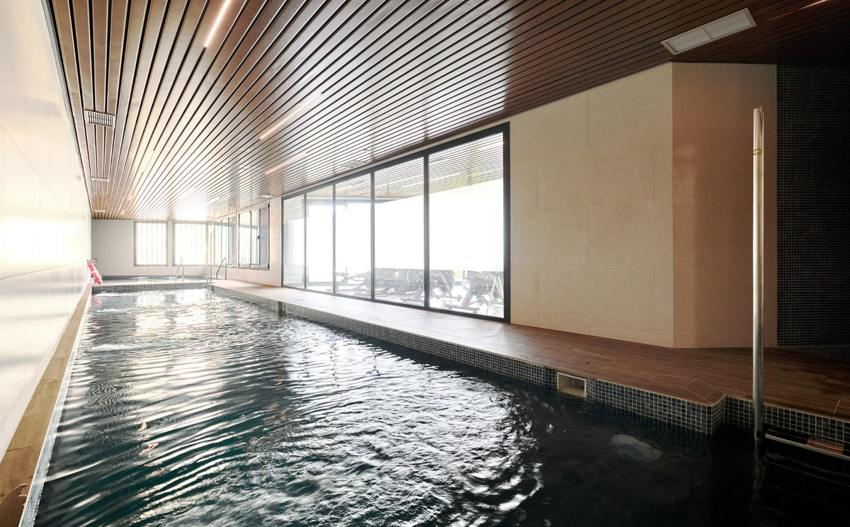 The complex offers exclusive common areas , including two outdoor swimming pools , a gym , a heated indoor pool , a jacuzzi and a magnificent communal rooftop terrace , equipped with a shared kitchen, guest spaces and panoramic sea views , creating a unique environment for relaxing and socializing.\n