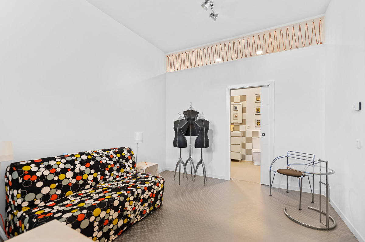 Following the courtyard to the left, one of the ensuite bedrooms is currently used as a music room, featuring a distinctive yellow piano that adds personality and warmth. Continuing straight ahead, the main living room opens up beautifully, styled with designer furniture and centred around a striking fireplace. One side of the room flows naturally into a library area, with an entire wall dedicated to books and magazines, creating a calm and inviting atmosphere.