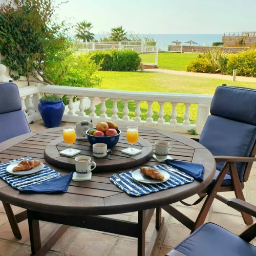 Upstairs, three bedrooms in neutral tones with built-in wardrobes offer direct access to a private terrace with sea views. The minimalist-inspired bathrooms combine natural wood with walk-in showers, creating a serene and contemporary atmosphere.