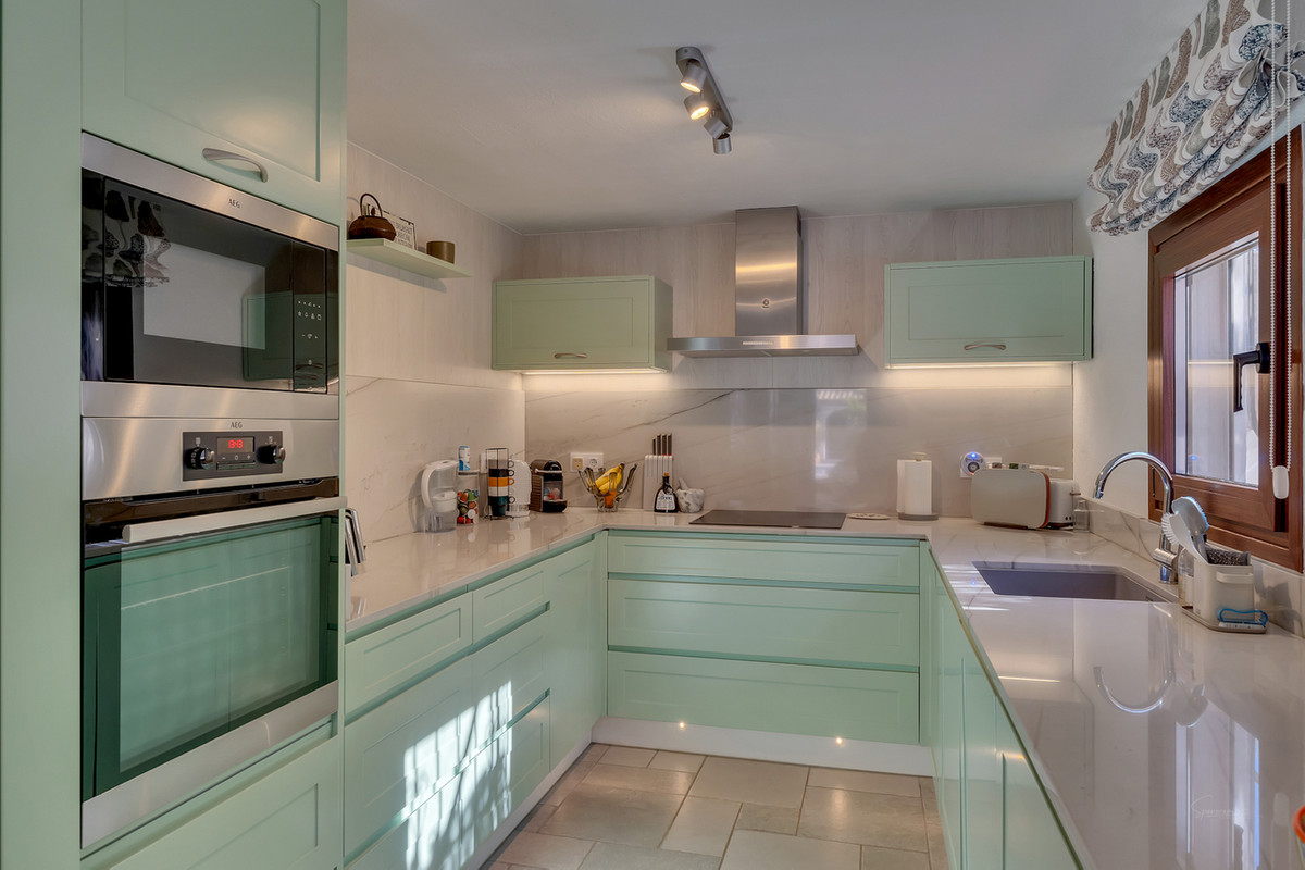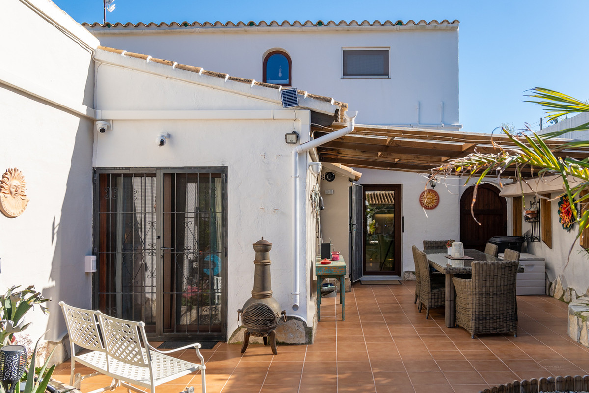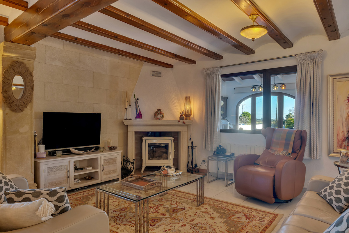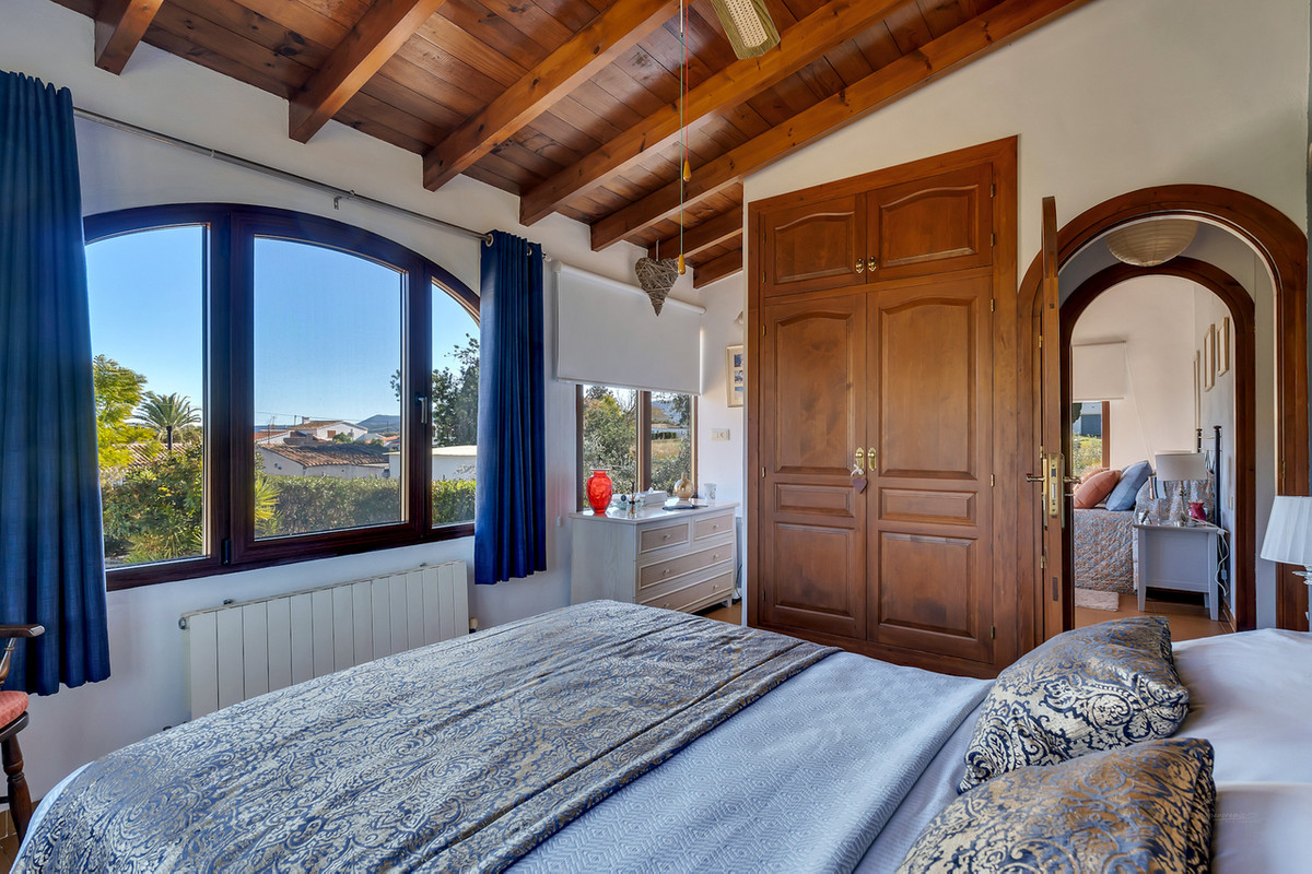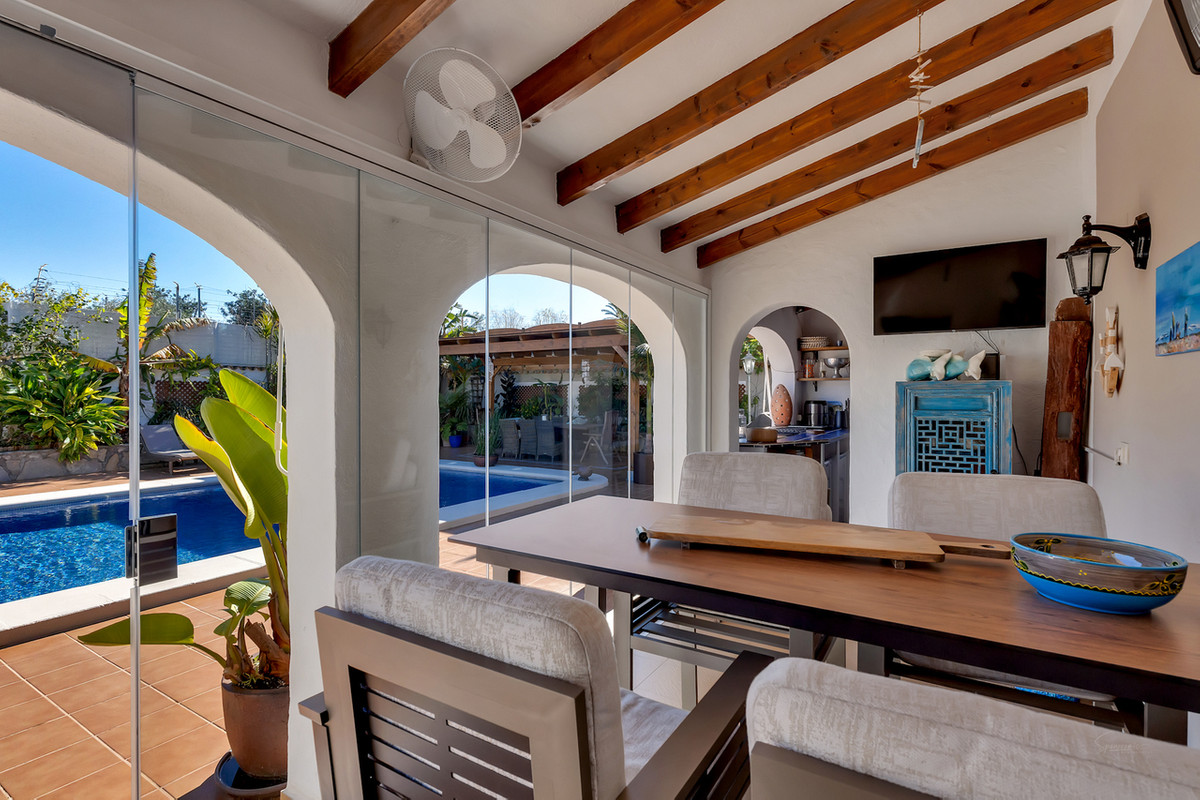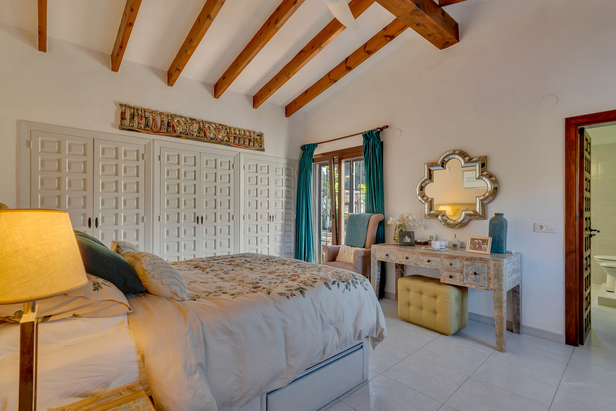 The driveway and entrance to the property offer exceptional "kerb appeal" and there is ample parking for several vehicles. The covered naya is fully glazed and offers unspoiled views of Montgó, this is a stunning outdoor living space for year round use. From here, you enter the very spacious, open plan living and dining room, which features beamed ceilings, Tosca fascias, and a wood burner. The separate, fully fitted modern kitchen and the master suite are accessed from this room. The master bedroom, with fitted wardrobes and a large ensuite shower room, has patio doors offering direct access to the garden terrace.