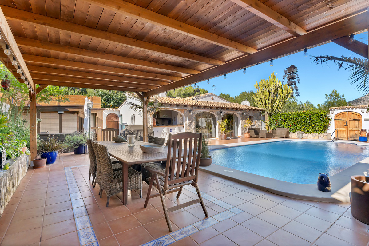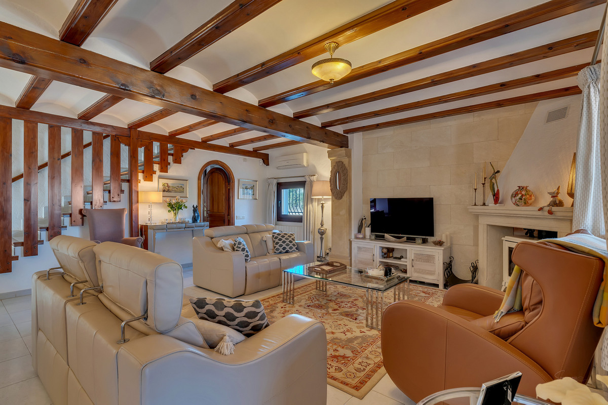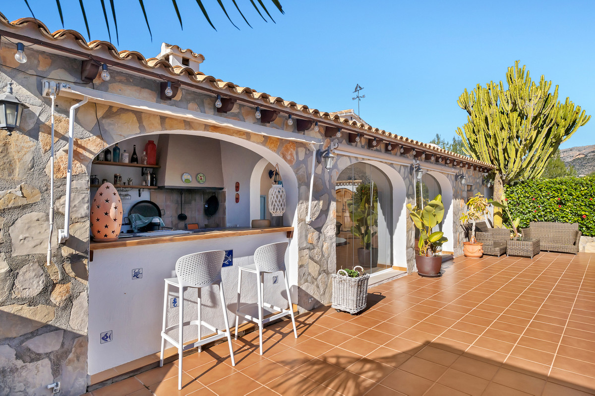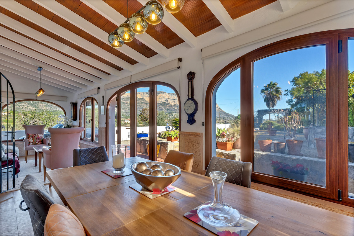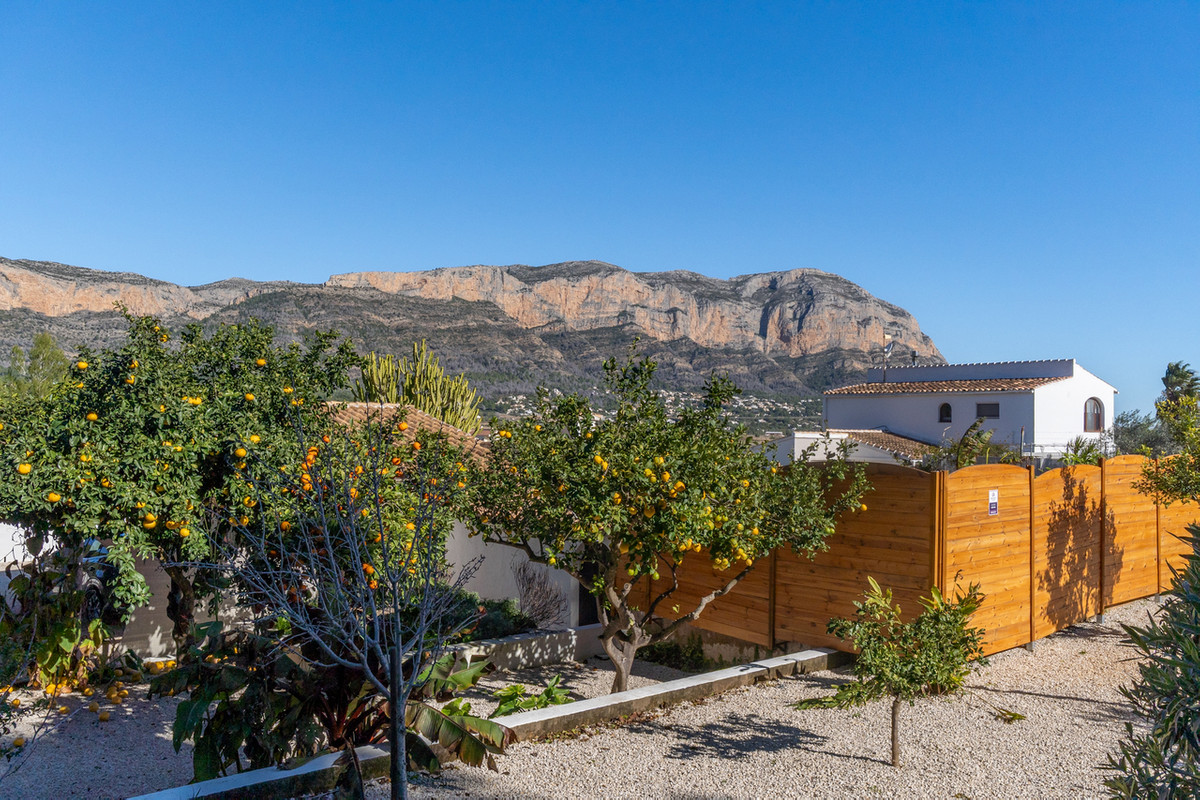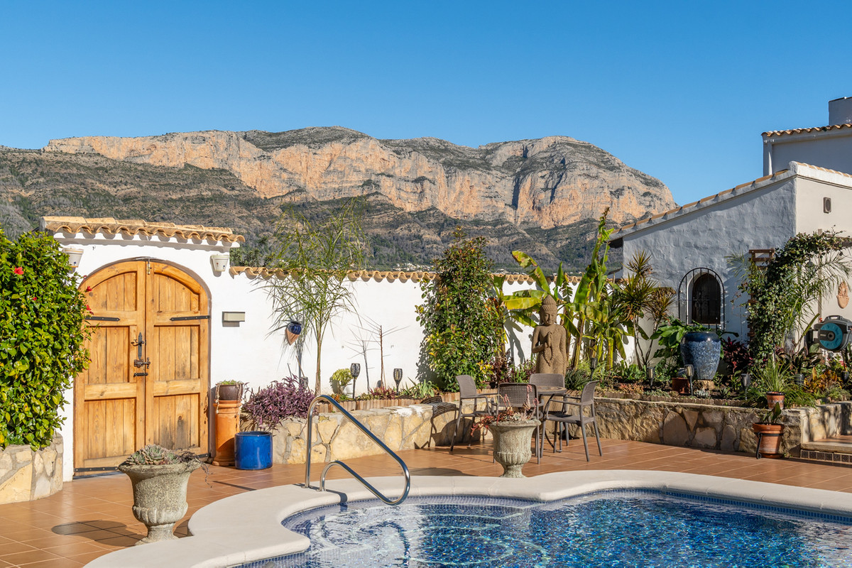This stunning finca offers a wonderful sense of privacy and tranquillity combined with modern elegance and convenience. The finca is accessed via a quiet lane with a sweeping driveway and the beautifully renovated villa is centrally positioned within the generous 2,426 m² flat plot. Nestled beside the Montgó Natural Park, it enjoys stunning views of the Montgó mountain and the surrounding countryside, with even a glimpse of the Mediterranean sea at Jávea.
