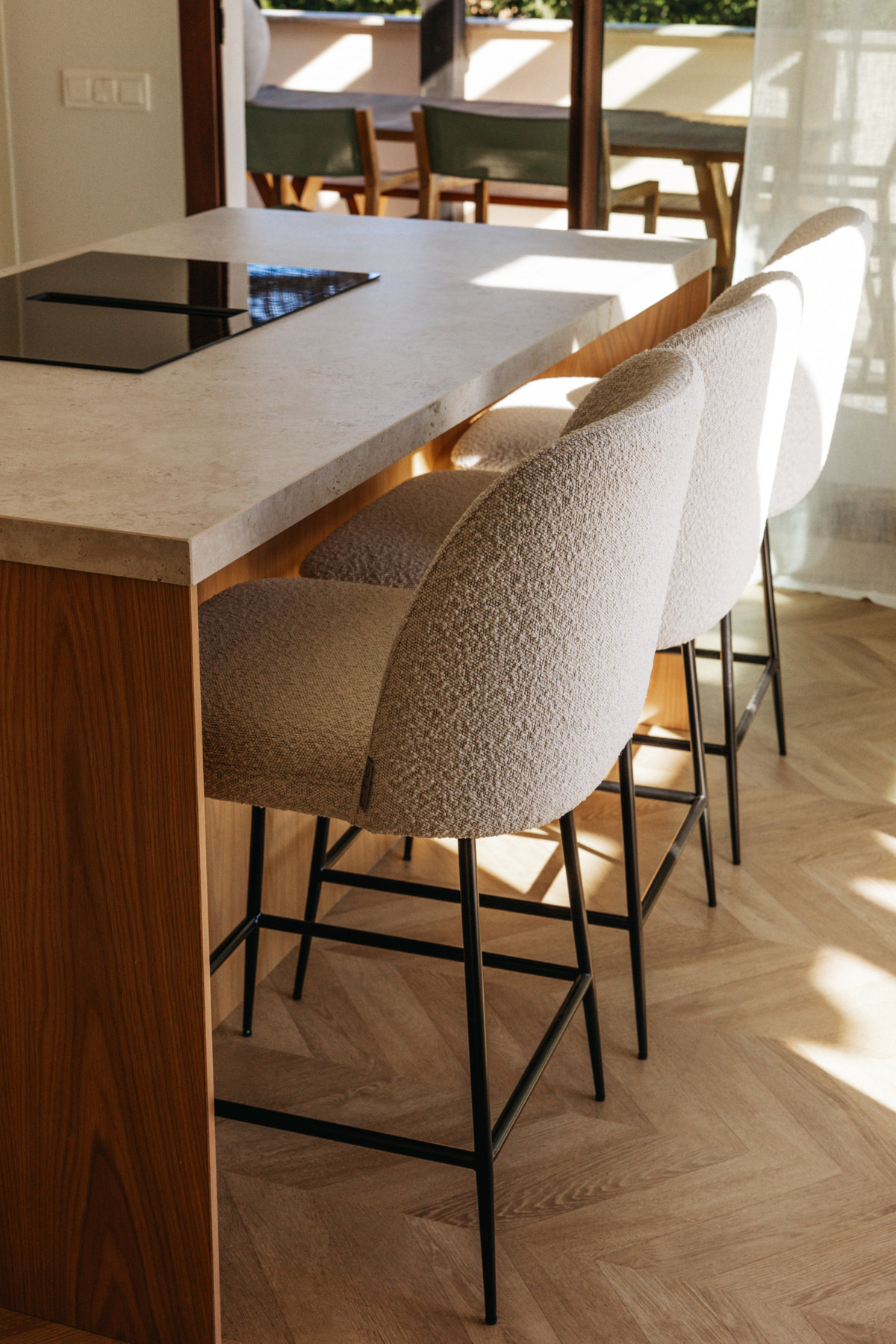 From here, you step directly onto a generous terrace offering spectacular sea and mountain views, complete with a Scandinavian outdoor kitchen, pizza oven, and BBQ, ideal for entertaining and sunset dining.