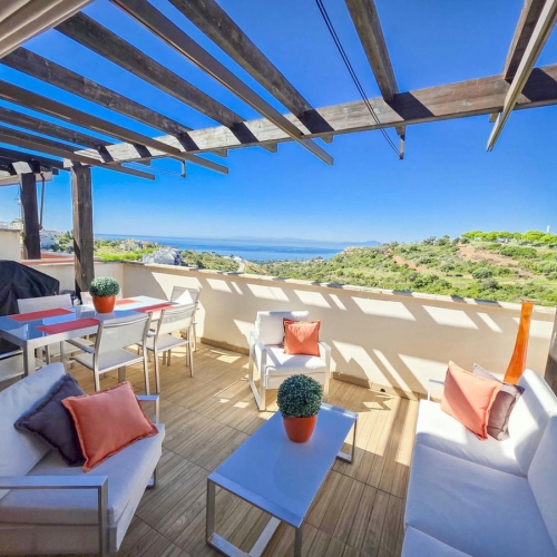 Discover this delightful duplex apartment in the serene coastal enclave of Chullera, Manilva, just a short 500-metre stroll from the pristine beaches of Playa de la Chullera and Punta Chullera. Renowned for its crystal-clear waters, rocky coves, and ecological richness, this area offers a perfect blend of tranquillity and natural beauty, with the Mediterranean Sea to the front and protected national parks like El Canuto de la Utrera and Sierra Bermeja rising behind – ideal for hiking and wildlife spotting. Only minutes from the charming Marina de la Duquesa with its array of restaurants, shops, and yachting facilities, plus the prestigious La Duquesa Golf Course, and easy access to Estepona (10 km) and Gibraltar Airport (approx. 35 km), it's superbly connected yet peacefully secluded.