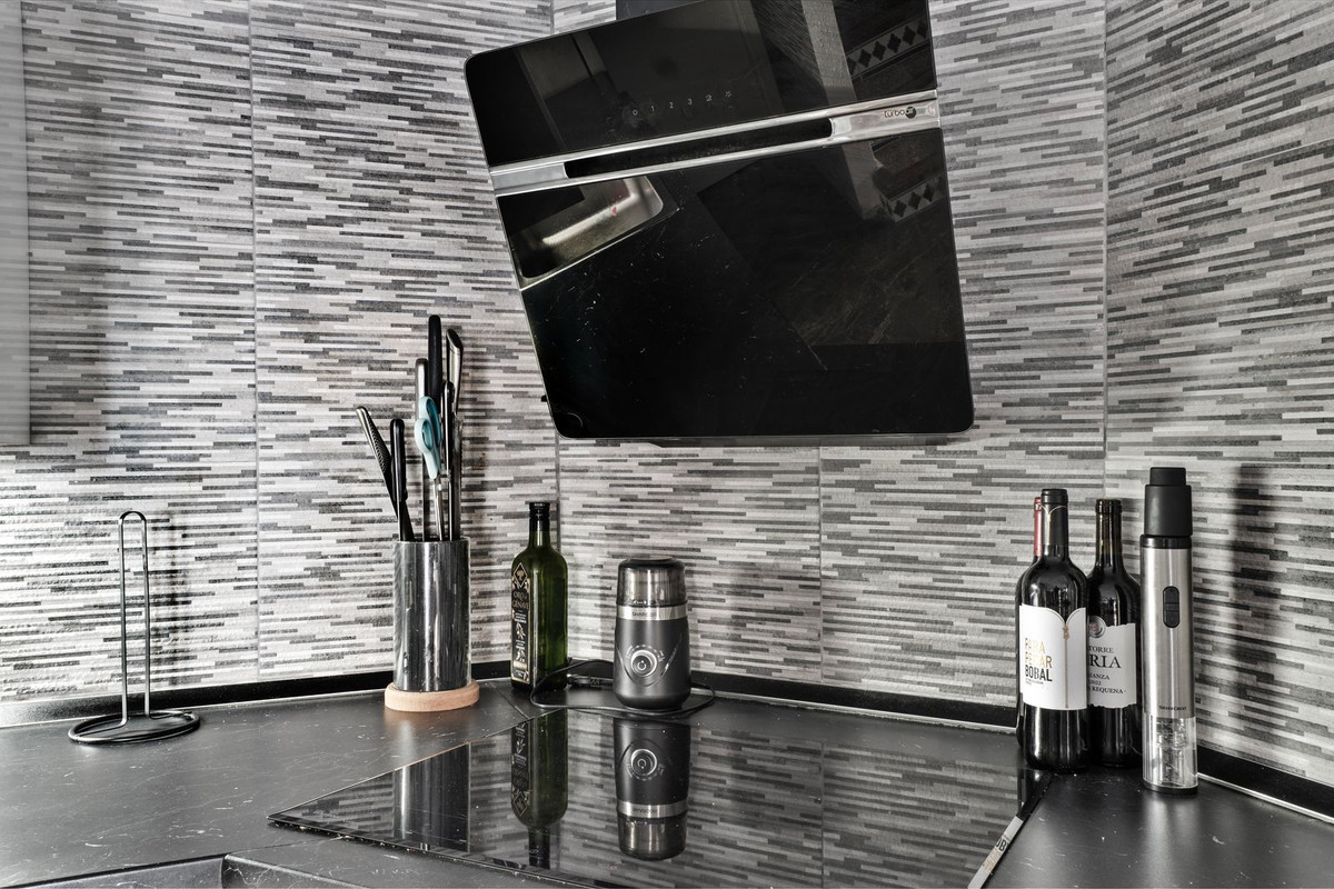 On the entrance level, you are greeted by a pleasant living room with ample space for both socialising and relaxation, as well as a modern kitchen offering good storage solutions. There is also a practical guest toilet on this floor. Upstairs, you will find two elegant bedrooms, one of which has access to a balcony with sea views. This level also features a fully tiled bathroom finished in a stylish design.