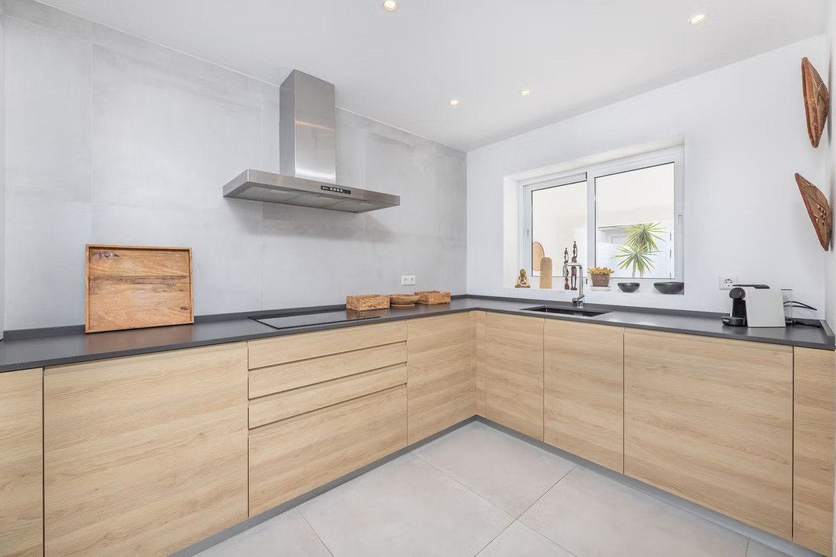 East Marbella, Elviria centre. For sale fantastic renovated and charming townhouse in Pueblo Sueco. This townhouse was refurbished to high quality standards in 2018 and beautifully decorated throughout. The property has a modern feel of top quality and is built over 2 floors. When entering the plot you will find an inviting west patio partially covered. It is furnished with chillout daybeds and there is lots of space for al fresco dining. There are mature types of spectacular cactus and easy maintaining planters. Entering the house you will find a handy guest toilet on the right and the fully equipped kitchen with all the necessary appliances. Also in the kitchen a cosy window to the front patio. The living room has large folding doors to the terrace, good space for two 3 seater-sofas and a nice round dining table next to the fire place. From the living room you access a lovely and spacious covered morning terrace with a 6 seater table, perfect to enjoy your breakfast! The stairs take you to the lower floor where we find a good sized bedroom with another auxiliary bedroom which could be used as dressing room. Another bedroom with a lot of extra space with a desk and dressing area. There are two bathrooms with generous showers, (one ensuite) and a washing/ storage room. These two bedrooms lead you to the patio on the lower floor from which you can access directly to the private pool club. At the patio you will find a beautiful deck where you can relax on the sunbeds and refresh using the solar shower. You can optionally be a member of the club for a yearly fee. There is Daikin hot and cold air conditioning system, underfloor heating in the bathrooms and high speed fibre optic. The neighbours are a combination of local and international nationalities. There is only a 10 minute walk to the best beach in Marbella, a 10 minute drive to Marbella city and less than 45 minutes to Malaga airport. There are as well several 18 hole golf courses like Santa Maria Golf, Santa Clara, Rio Real and Marbella Golf. Marbella has become a brand in Europe and all over the world with 320 days of full sun a year and total of 2900 hours of sun. Elviria represents the very essence of quality of life on the Costa del Sol. It is located in a unique natural setting and has a fantastic range of facilities nearby, including three 4-and-5 star hotels: Don Carlos, Marriott and Estrella de Mar, renowned golf courses such as Santa María and Green Hills, a Michelin-starred restaurant, Nikki Beach Club and one of the best beaches on the coast, all flanked by outstanding bars and restaurants, supermarkets and a local street market every Friday and an organic market every other Saturday. In addition, there is a Town Hall, doctor's office, post office, a wide range of schools, including private schools...all within walking distance. This is a unique opportunity and the ideal location for both a permanent residence or dream holiday home.