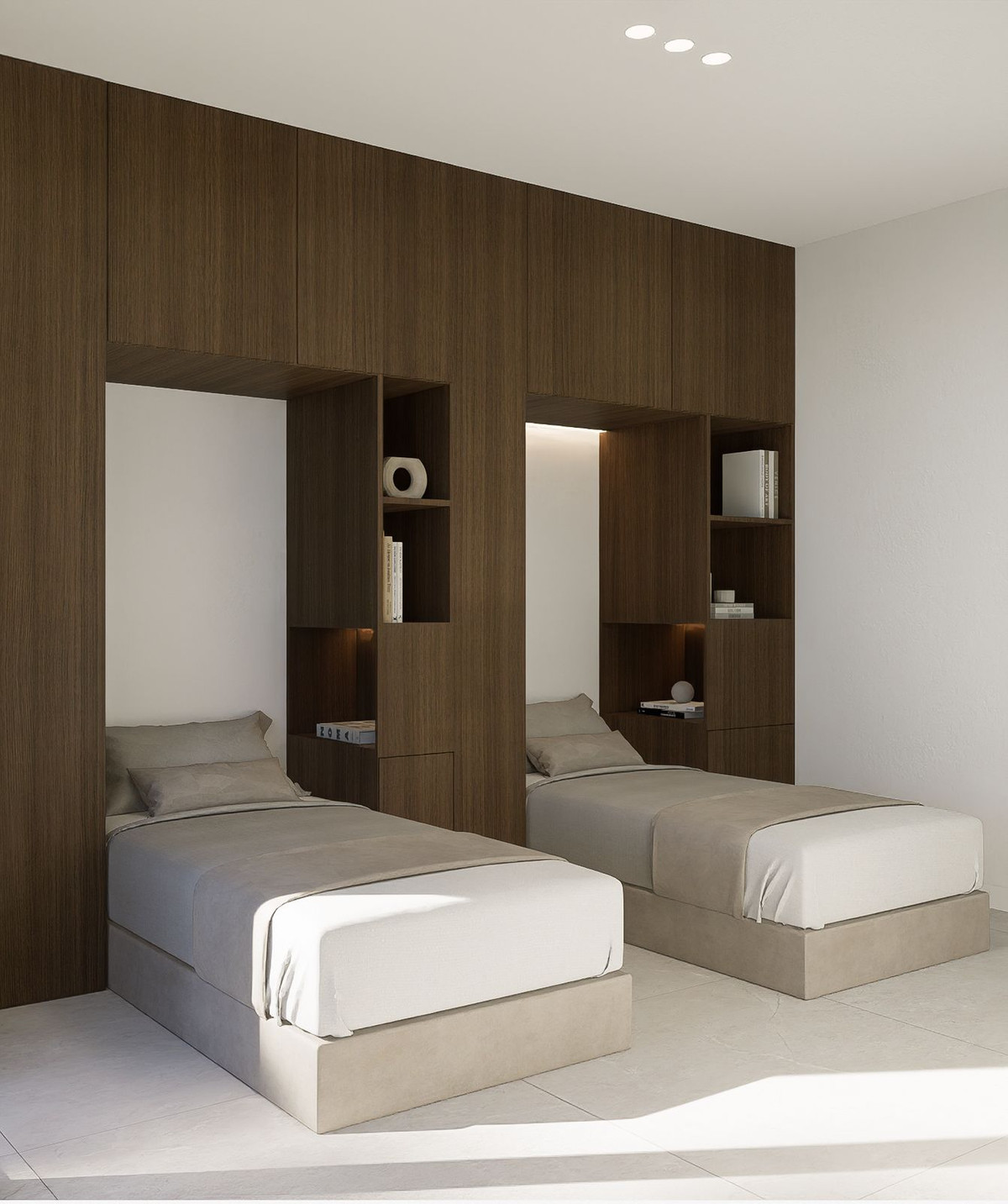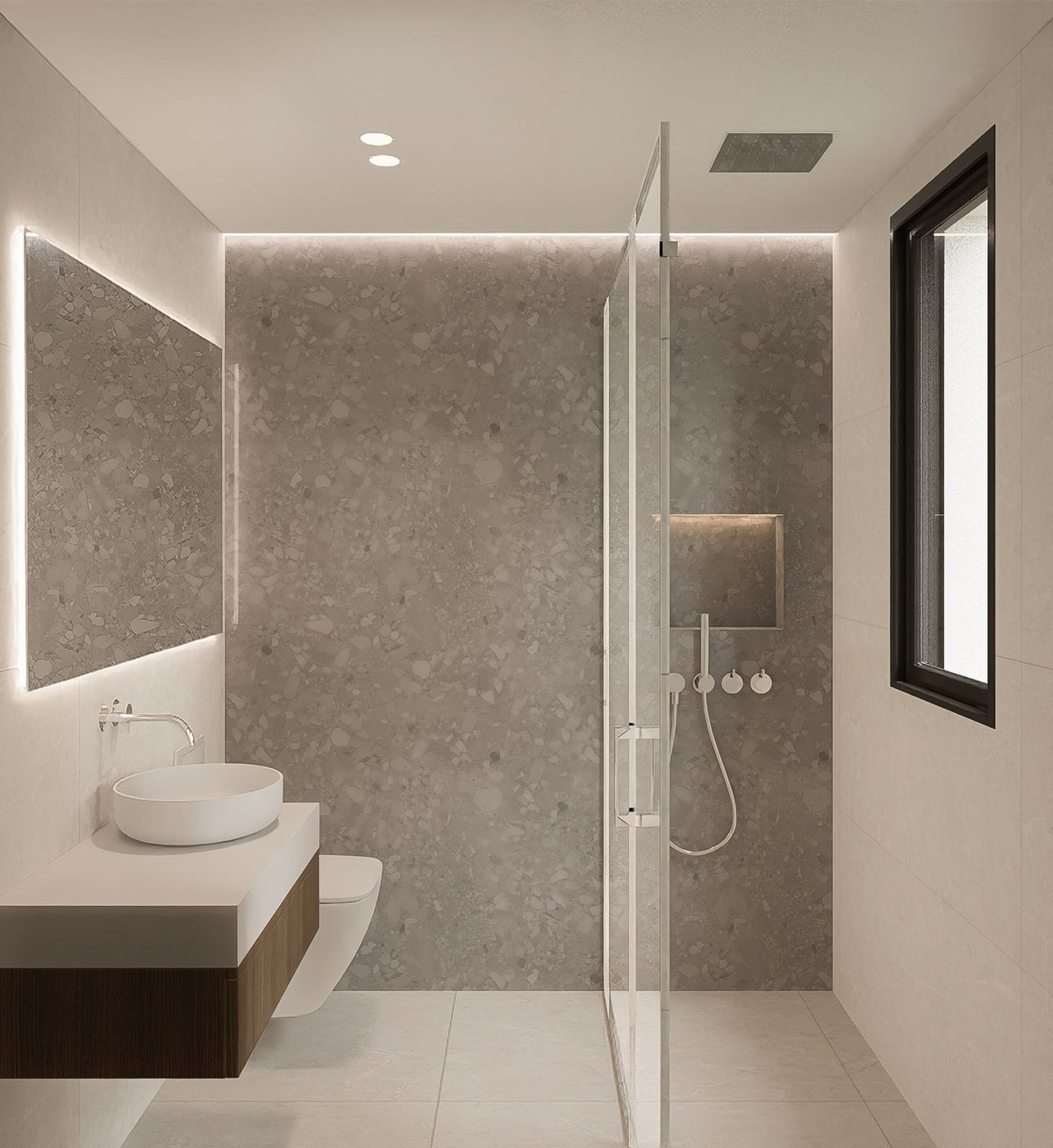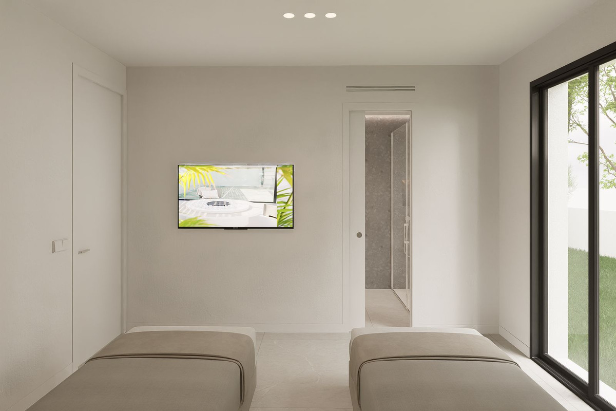 Filled with natural light, the villa boasts open-plan living areas with large windows and glass doors, seamlessly connecting indoor and outdoor spaces and enjoys open views with pleasant sea views. The modern open-plan kitchen features a large central island with an integrated cooking field, ideal for both everyday living and entertaining guests.