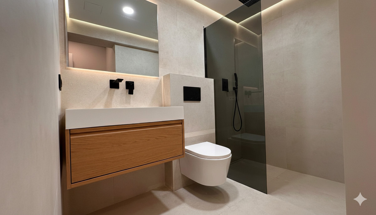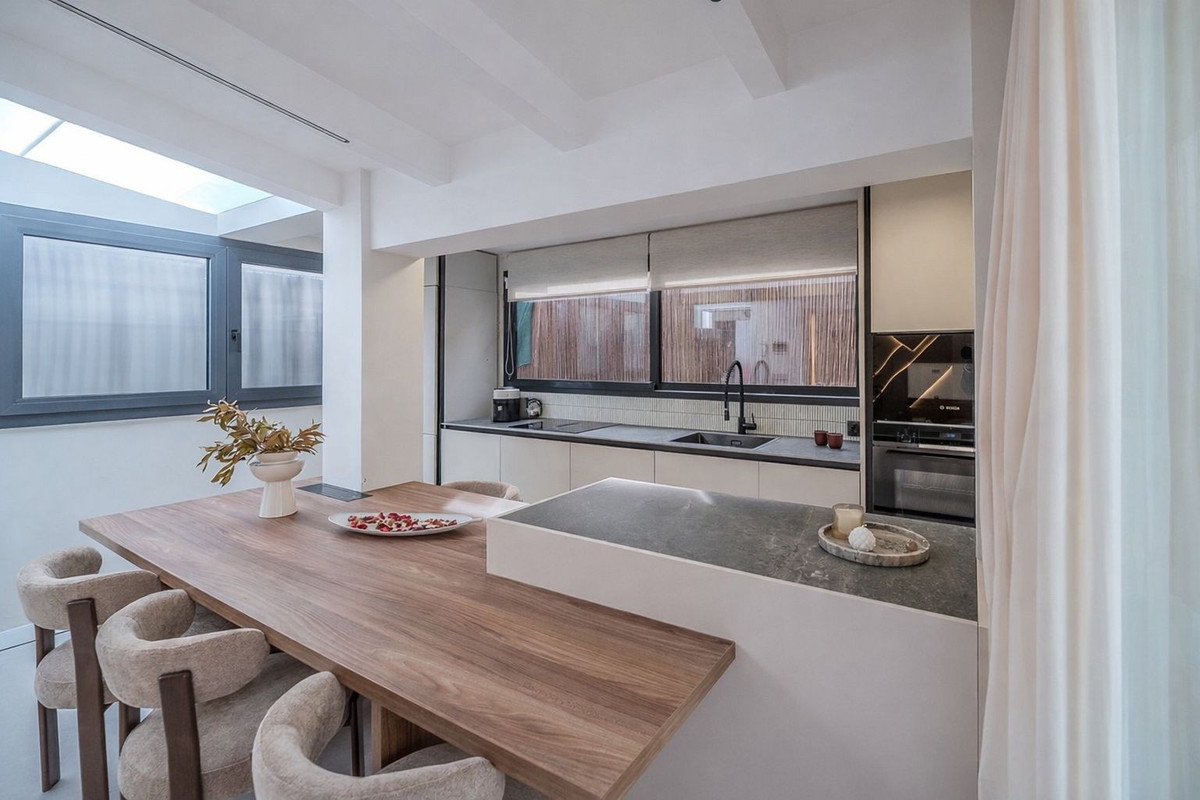 Inside, the apartment has been recently refurbished to a high standard, combining contemporary style with practicality. The open-plan living and dining area flows seamlessly into a fully fitted kitchen, perfect for entertaining friends or enjoying quiet family dinners. A cosy fireplace adds warmth on cooler evenings, complemented by air conditioning for year-round comfort. Both bedrooms feature built-in wardrobes, and the bathrooms are modern, bright, and fully equipped.