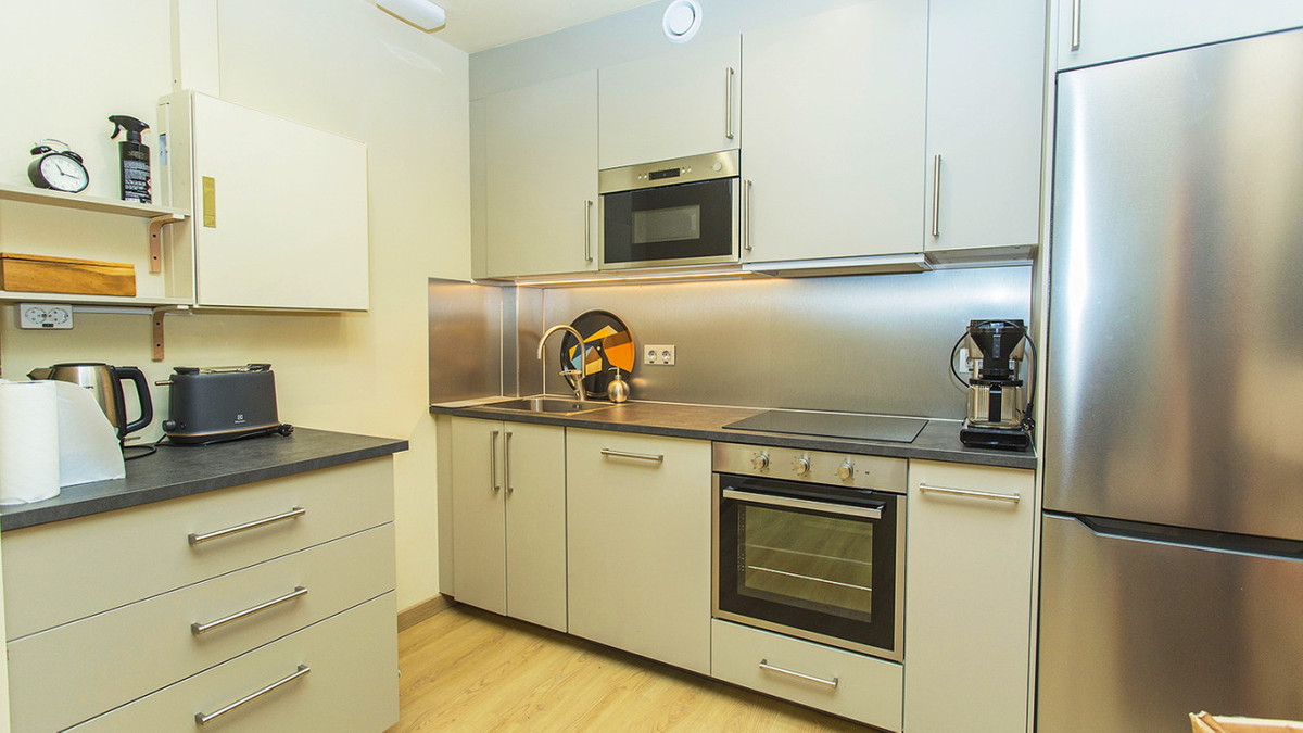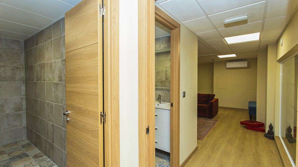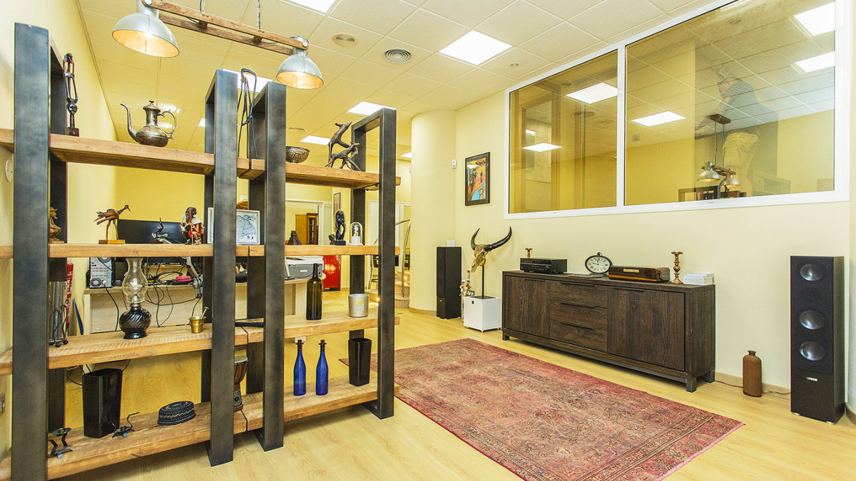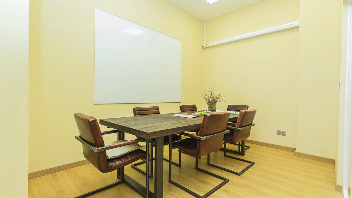 There are two full bathrooms. The space measures 105 square meters. Some of the furniture is included, such as desks, etc. Central air conditioning, alarm, etc. Wooden floors and a full kitchen with appliances. Conference room.