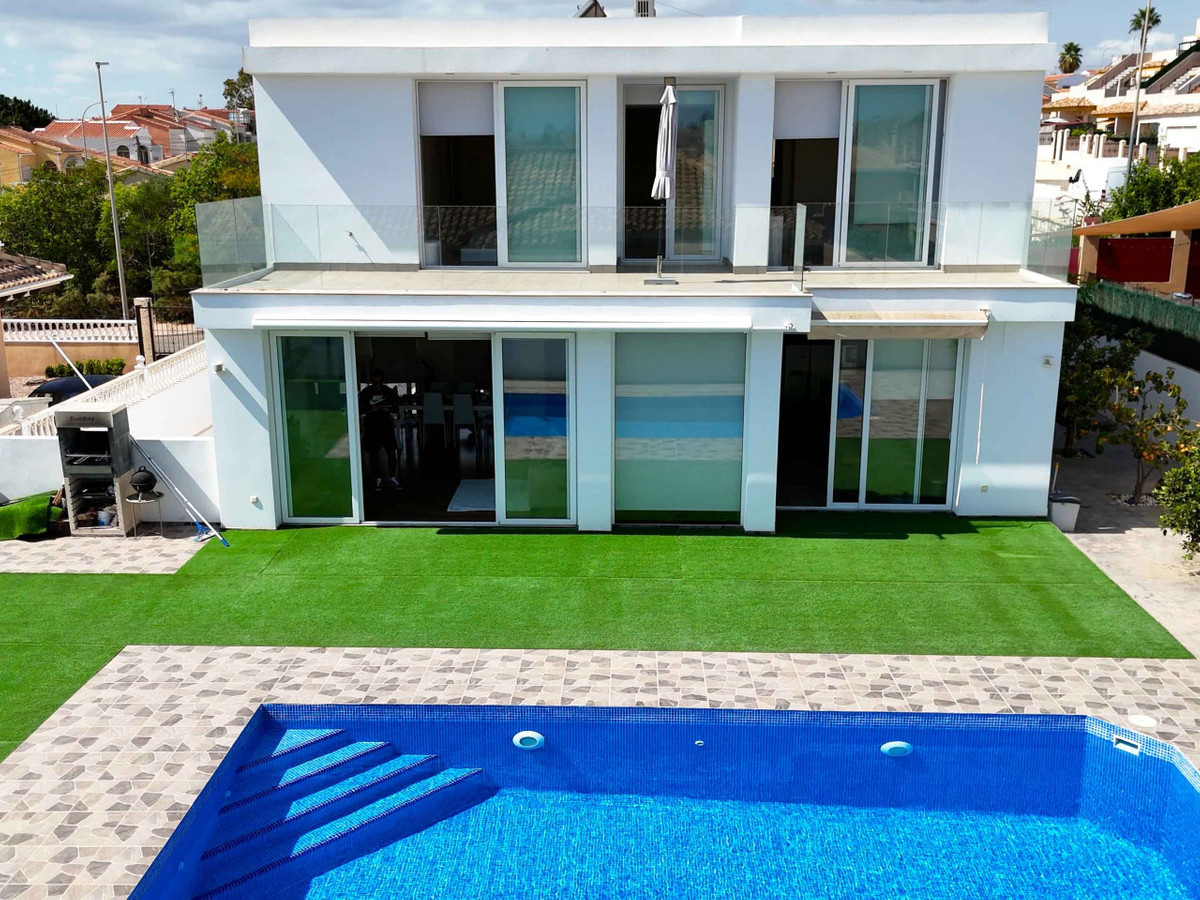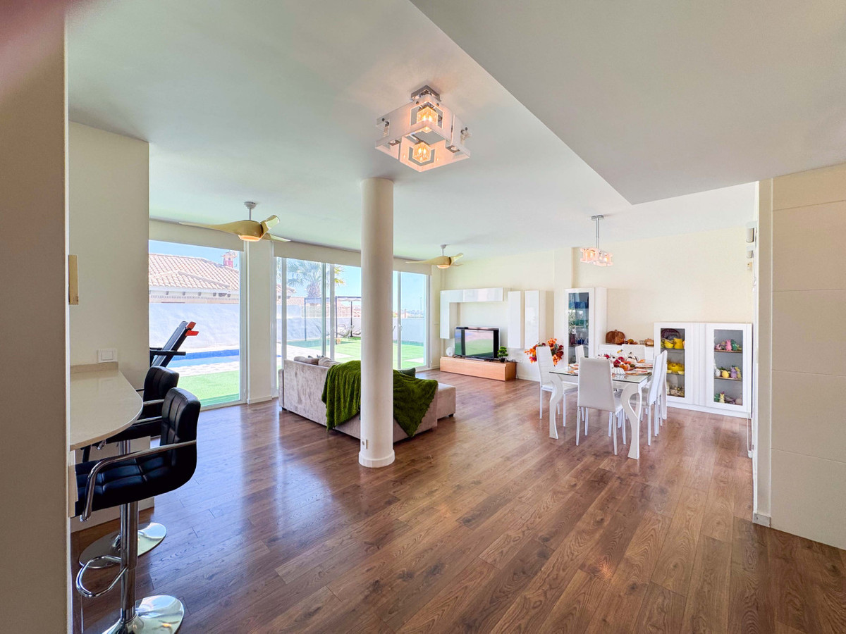 Modern villa located in San Fulgencio, La Marina Oasis area, featuring a sun-oriented pool, sauna, and double garage. This renovated and well-maintained property includes solar panels and two pergolas providing shade and elegance outdoors.The layout is spacious and practical: the upper floor has three bedrooms, two bathrooms, and a walk-in closet, plus a large balcony connecting the bedrooms, perfect for enjoying views and fresh air. The main floor offers one bedroom, a large open-plan kitchen, living room and dining area with views of the mountains and pool, creating a bright and welcoming space.The lower floor contains a laundry room, shower, sauna, two additional bedrooms, a large storage room fitted as a home cinema, a pool motor room, and a leisure room. This villa combines comfort, space, and amenities perfectly.La Marina Oasis in San Fulgencio is a quiet area with nearby services and easy access to beaches and shopping centers. It is an excellent option for permanent residence or investment with seasonal rental potential. Schedule a physical visit, virtual tour, or request floor plans. Contact us for more details and to arrange your visit.---