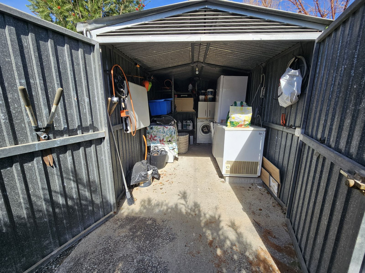 Grunden har flere adgangsveje, en overdækket parkeringsplads til to biler samt et stort udendørs parkeringsareal. Resten af grunden er velegnet til dyrkning af frugt og grøntsager, med en tydelig opdeling mellem boligområdet og dyrkningsarealet, hvor der findes appelsin-, citron- og mandarintæer samt et stort pekannøddetræ.