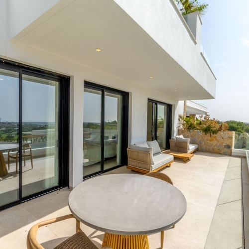 2 værelses Hinojo lejlighed i Las Colinas Golf~Hvis du drømmer om et luksushjem på Las Colinas Golf and Country Club i det mest gunstige klima i Spanien, tilbyder vi dig denne møblerede drømmelejlighed i Community Hinojo 1 på anden sal. Når du træder ind her, bliver du mødt af en varm og hyggelig atmosfære. Denne sydvendte lejlighed er kærligt møbleret og indrettet i Ibiza-stil. Stuen har tre store vinduer i hele bredden, som alle kan skydes op, så terrassen med det samme flisegulv bliver en forlængelse af stuen. Fra denne terrasse med hyggeligt loungesæt kan du nyde en storslået udsigt med masser af grønt (skov), hav og Mar Menor med Mangaen. Køkkenet er udstyret med luksuriøse Bosch-apparater og kan lukkes helt af med en bred, hvid væg.~Der er to soveværelser med store indbyggede skabe og ekstra opbevaringsplads under sengene.~Master soveværelset har et luksuriøst badeværelse en suite, det andet soveværelse har også sit eget separate badeværelse.~Lejligheden inkluderer underjordisk parkering og privat opbevaringsrum. Store fordele ved denne lejlighed er: Fuldt møbleret~Sydvendt terrasse~Meget velholdt og ren~Som ny; ingen skader eller defekter~Fantastisk udsigt~Fuldt beliggende på den solrige sydside~Terrassen er lukket med glasvægge, så du også har fuld udsigt, mens du sidder~Aircondition i alle rum~Filtreret drikkevand~Vaskemaskine / tørretumbler tilgængelig i udendørsskabet Las Colinas Golf & Country Club~En verden for sig! Las Colinas Golf & Country Club er et af de mest prestigefyldte resorts på Costa Blanca! Det er et eksklusivt og unikt 330 hektar stort golfresort med mange sportsfaciliteter, herunder golf, padel, vandreture, fitness, yoga og meget mere. Det er en verden for sig, hvor du kan nyde en sund middelhavslivsstil. Med et exceptionelt klima og førsteklasses service er resortet blevet anerkendt som "Spaniens og Europas førende villaresort" af World Travel Awards i de seneste år. Beliggende blandt bakkerne i Dehesa de Campoamor – på Middelhavskysten syd for Alicante – er Las Colinas Golf & Country Club et unikt naturområde, der er blevet omhyggeligt bevaret, og hvor eksklusive hjem er blevet integreret i omgivelserne, hvor du kan slappe af og nyde landskabet. Dette resort, med nogle fremragende restauranter og Wow Beach by Las Colinas, har et internationalt ry og er velkendt og eftertragtet af berømtheder. Find dit drømmehjem i dag ved at tage et kig på de smukkeste og mest eksklusive hjem, vi har at tilbyde!