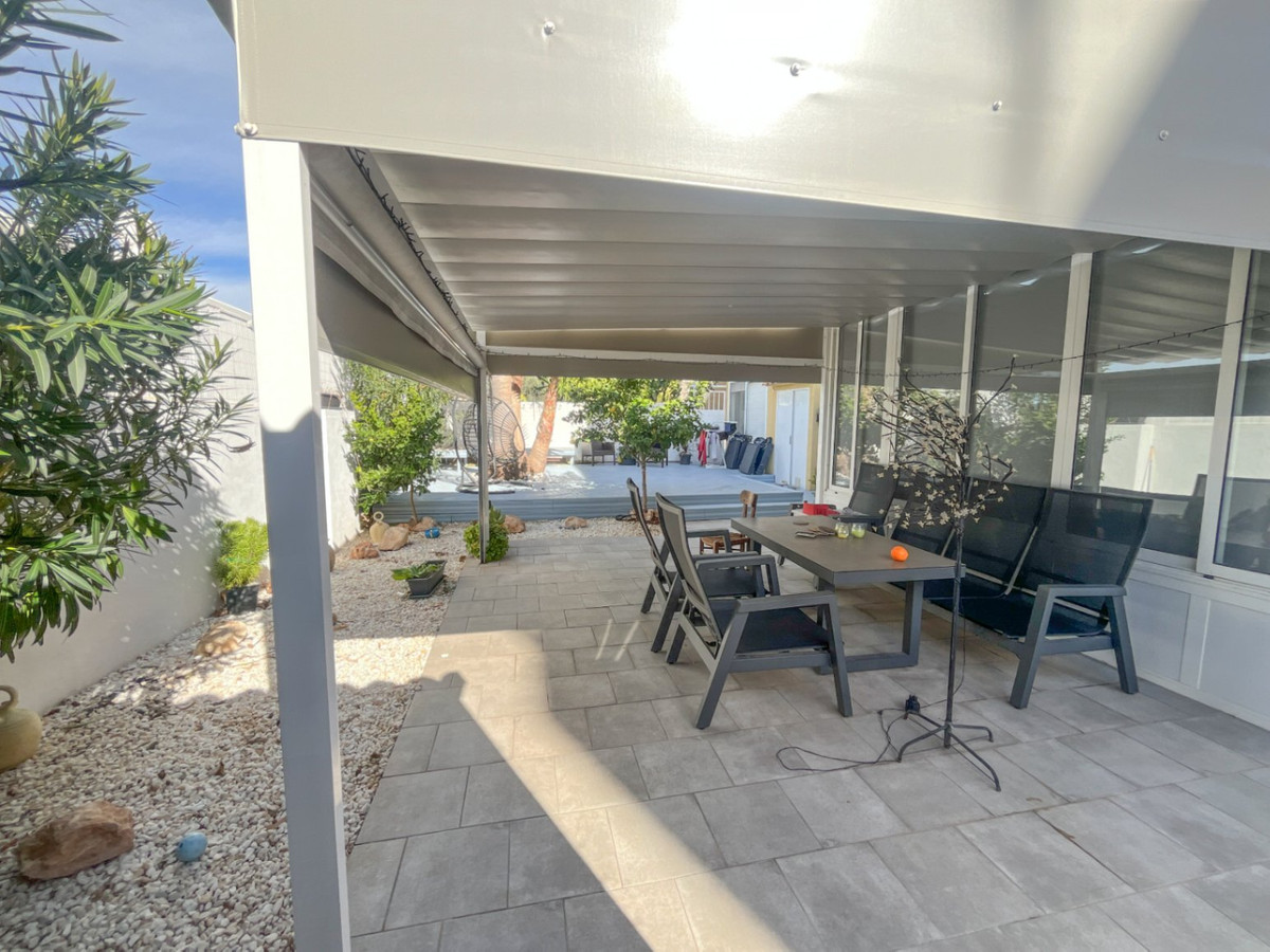 The property benefits from a huge wraparound terrace, providing both sun and shade throughout the day, and overlooks the beautifully maintained communal swimming pool and garden areas. The outdoor space is ideal for entertaining and relaxing, featuring a fully equipped outdoor kitchen, mature palm trees, and established orange and lemon trees, creating a private Mediterranean atmosphere.