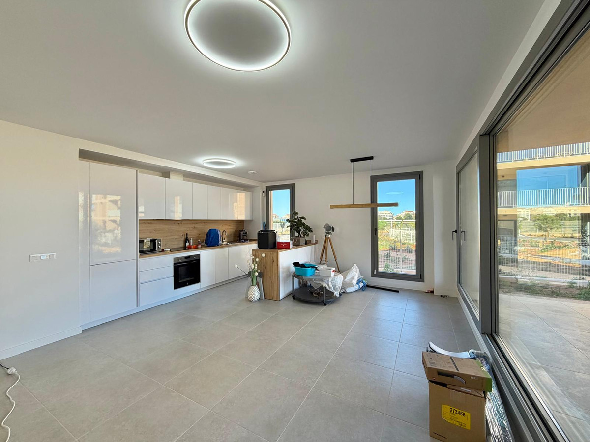 Inside, the spacious and bright living-dining room with a modern open-plan kitchen creates a functional and cozy space, with direct access to the terrace and garden. The layout is completed with three spacious bedrooms with fitted wardrobes and two full bathrooms, one of which is en suite.