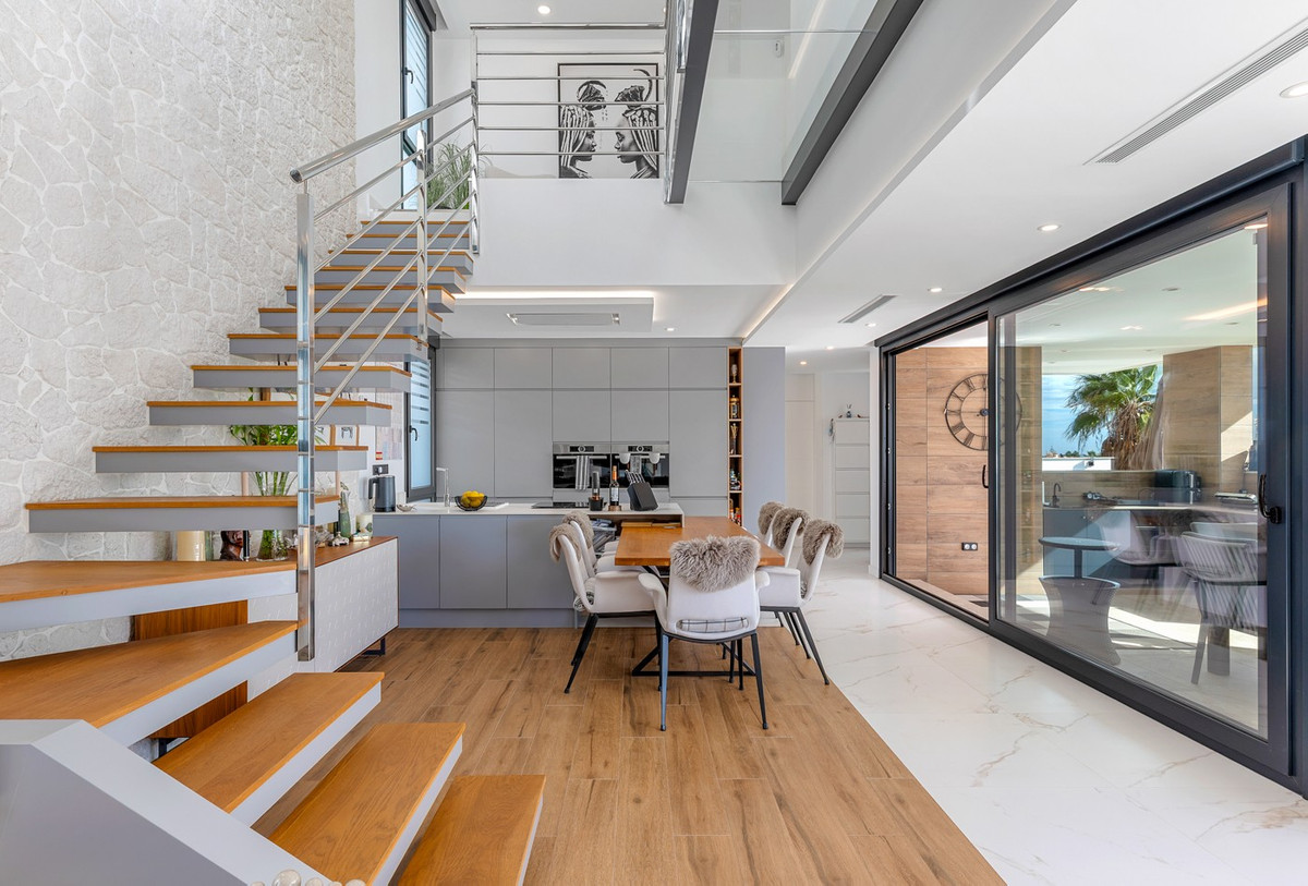 Internally, the villa spans two levels and is designed to maximise light, flow, and functionality. The entrance hall separates the main living spaces, leading to an open-plan lounge, dining, and kitchen area, featuring bespoke furniture, contemporary finishes, and full-length patio doors opening to the garden and pool terraces. The high-spec kitchen is fitted with premium Bosch appliances and includes an integrated family dining table.