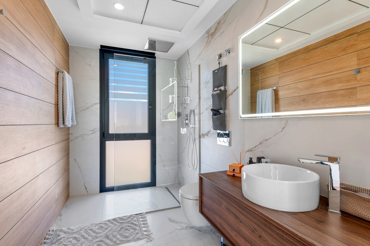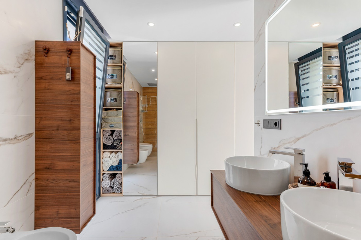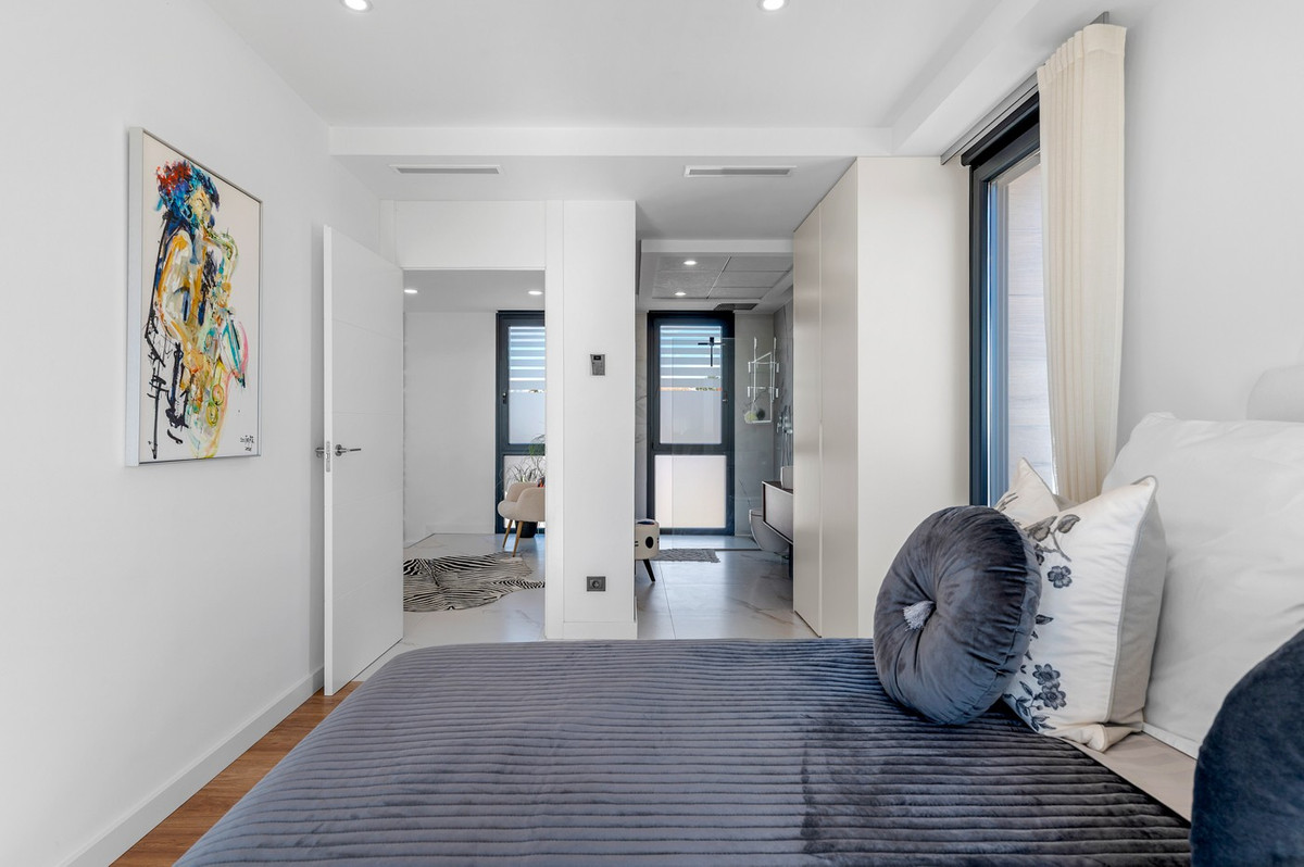 The ground floor also houses two elegantly appointed bedrooms are located on this level, one to the left and one to the right each with en-suite bathrooms, built-in wardrobes, garden, pool views, and partial vistas of the Salt Lakes. Underfloor heating runs throughout the entire property, enhancing comfort in every season, while a fully integrated smart home system allows complete control of the villa remotely from anywhere in the world.