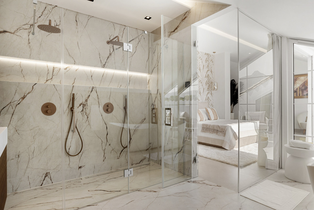 The penthouse includes five beautifully designed bedrooms, including a spectacular master suite on the upper level. With slanted ceilings, a generous walk-in closet, a spa-inspired bathroom, and a private terrace overlooking the sea and La Concha mountain, this is an oasis of complete relaxation. Two additional bedrooms feature en-suite bathrooms, while two share a modern family bathroom. A flexible fifth room serves perfectly as a guest bedroom or office. A separate laundry room with terrace access shows that even the practical details have been given the same attention.