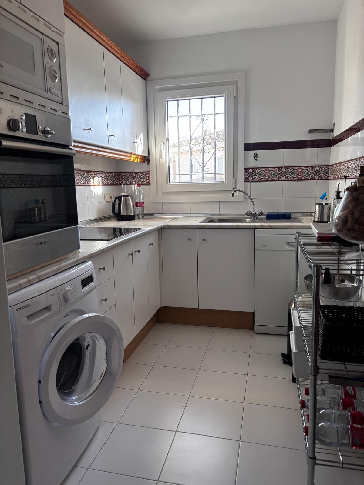 Built with high-quality materials, the townhouse includes marble flooring, renovated double-glazed windows and patio doors with wood-effect finishes, fitted wardrobes, and air conditioning with heat pump in the living room and both bedrooms and electric awning. Additional storage space is conveniently located under the staircase.