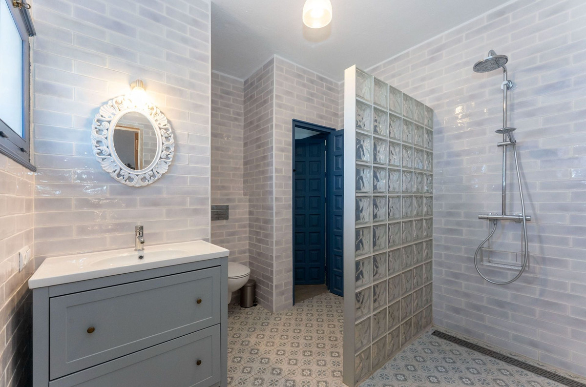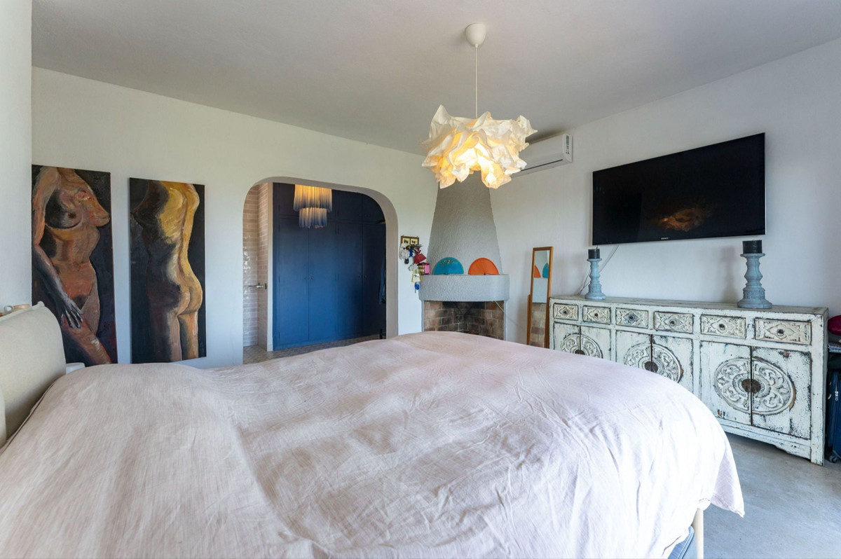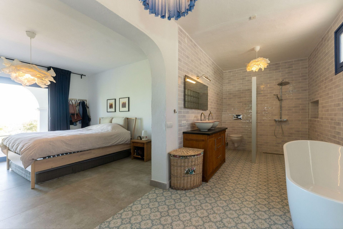 A hallway leads to the sleeping accommodation, where two guest bedrooms share a family bathroom, conveniently located between them. There is also a cloakroom and a large laundry/utility room offering further storage. The master bedroom, located at the end of the hallway, is a true retreat with direct access to the terrace, an open fireplace, and a stylish en-suite bathroom with a walk-in shower and freestanding bathtub.