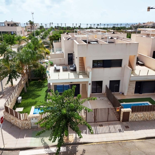 Beautiful semi-detached house located in a quiet residential area, just a three-minute walk from the beautiful El Mojón beach. This exceptional property stands out for its generous outdoor spaces, excellent condition, and private solarium with sea views.