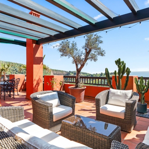 The property features two spacious double bedrooms, a full bathroom, and a separate washroom that can easily be reconverted into a guest toilet. The bright lounge opens onto a generous south-east facing terrace boasting panoramic sea and pool views. A second west-facing balcony offers the perfect spot to enjoy the afternoon sun.