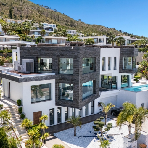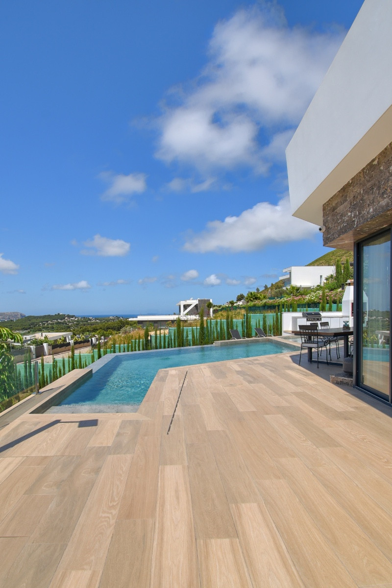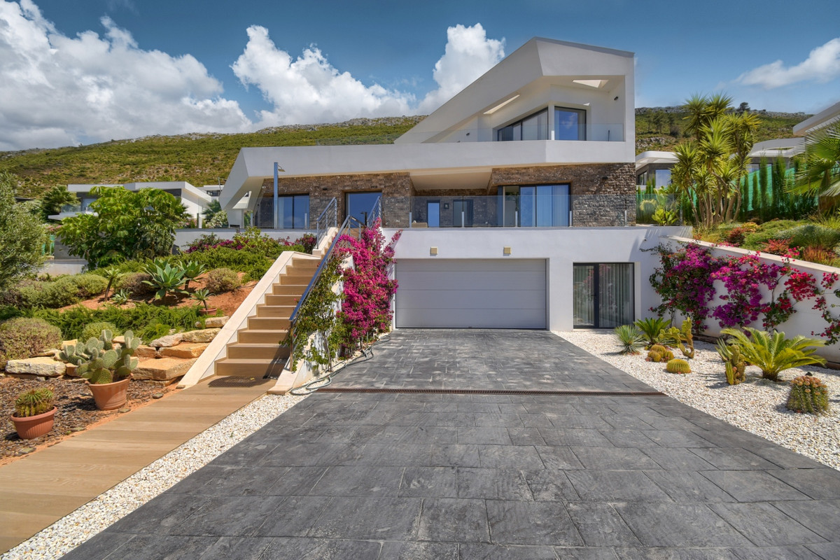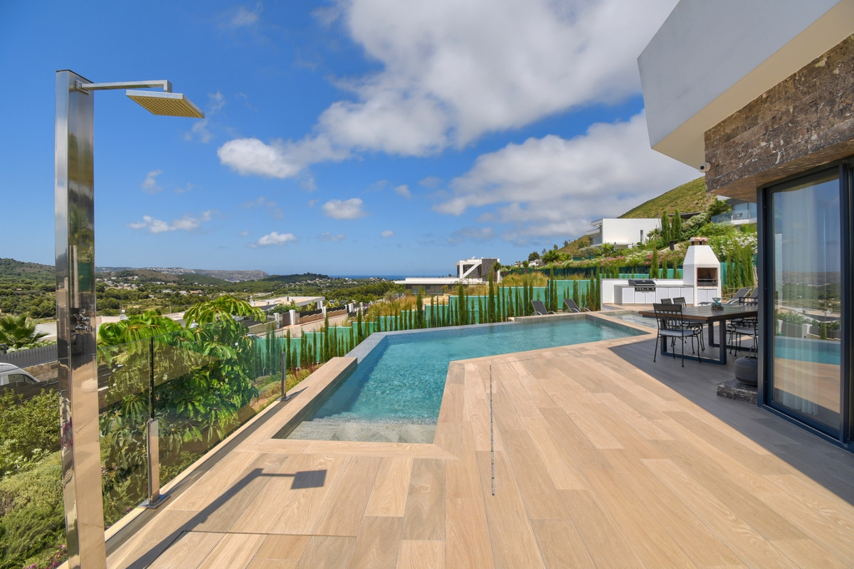 Beautiful Villa built by an award winning developer in 2020, situated in our luxurious residential area of Monte Olimpo in Jávea, just a few minutes from the beach, schools, restaurants, supermarkets, and the golf course. This beautiful modern Villa with natural stone on part of the facade has sea, mountain and valley views. With 283 m2 built, the Orion villa consists of three floors, all with large windows that give an incredible natural light to this luxury villa.On the ground floor, there is a garage for 2 cars, a large double bedroom en-suite, and a large storage room.The main floor consists of 2 bedrooms and a bathroom, a large open plan kitchen, dining and living room overlooking the large terraces, the infinity pool and jacuzzi both heated with separate control, and the views over Javea and the surrounding villages. In addition, for those who enjoy barbecues, this villa offers 2 barbecues with gas and charcoal burners. On the upper floor we find the master bedroom with en suite bathroom and a very nice dressing room with plenty of storage area. This room connects to a large private terrace where you can enjoy the Mediterranean climate. This is the perfect villa to enjoy the breathtaking views and the fabulous Mediterranean lifestyle.
