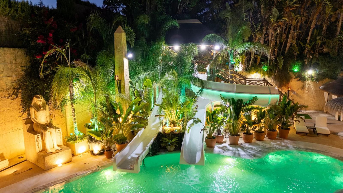 Located in Zone G of Sotogrande Alto, this large luxury villa was built by the current owner over a period of 10 years to a very high standard, using state-of-the-art materials and a wide selection of incredible crystal chandeliers. The large entrance hall features two curved marble staircases leading to the upper floor, where there are three bedrooms, one of which is the master suite, with Egyptian-themed décor, hand-painted walls, ornate moldings, and solid stone pillars. There is also a private living area overlooking the garden and pool. There is a dressing room and the main en-suite bathroom with a whirlpool tub and double walk-in shower. Two other spacious bedrooms, both en-suite, are located on this floor, connecting to the private terrace and from there, up the stairs to the private solarium. Inside the villa there is an elevator serving all 3 floors and on the ground floor there is the large living room, dining room, and doors to the covered terrace and pool area. There is also a service kitchen with pantry, utility room, and laundry/storage room. There is also a fully equipped cinema room with 8 leather seats. In the semi-basement is the entertainment suite, all decorated and hand-painted in an Egyptian theme, with matching decorations. There is a poker table, seating areas, a large cocktail bar, a modern gym with changing rooms and showers, and two further bedrooms with en-suite bathrooms, also in Egyptian style. In the center of the living room is a miniature theater modeled after London's West End theater, with two boxes and 37 seats. Luxuriously decorated in theatrical style, it comes with the complete set and props for a production of the musical Phantom of the Opera and offers a complete sound and lighting system, as well as the potential to show movies with the cinema system and stage for small private concerts. Work on the villa and grounds has not been completed, but this is a unique and personalized property, well worth viewing for the buyer looking for that special style home.