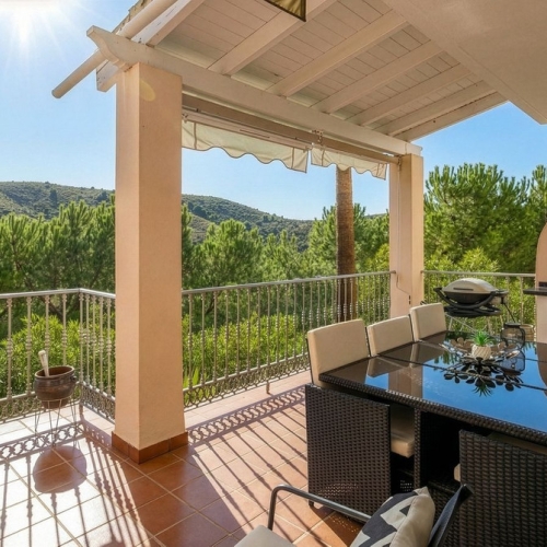 You enter the property via the private front gate, where you have your own parking space. You go up a few stairs to the main level where the property and terraces are. You have a large front terrace that is easy maintenance with flowerbeds that have automatic irrigation in place, a covered terrace with nice seating area and amazing views of the golf course, mountains and the sunset. The property is set over two floors, as you enter to the left you have a full bathroom, stairs that go up to the 2nd level and a under the stairs storage room. In front of you is a large fully equipped kitchen with a door that accesses the back terrace. From the hallway to the right you have the large living / dining room with air conditioning and two patio sliding doors that lead out to the front of the terrace. Upstairs straight in front of you, is the master bedroom with fitted wardrobes, private terrace and en suite full bathroom. To the left of the hallway you have the other 2 double bedrooms with fitted wardrobes and a bathroom to share. The house has 2 split centralizad air conditioning.