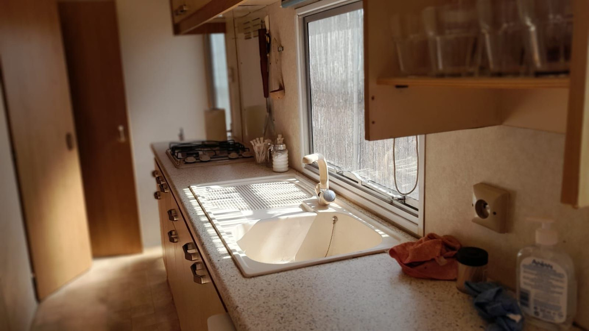 Covered structure with a converted caravan on site and electricity via solar panels.