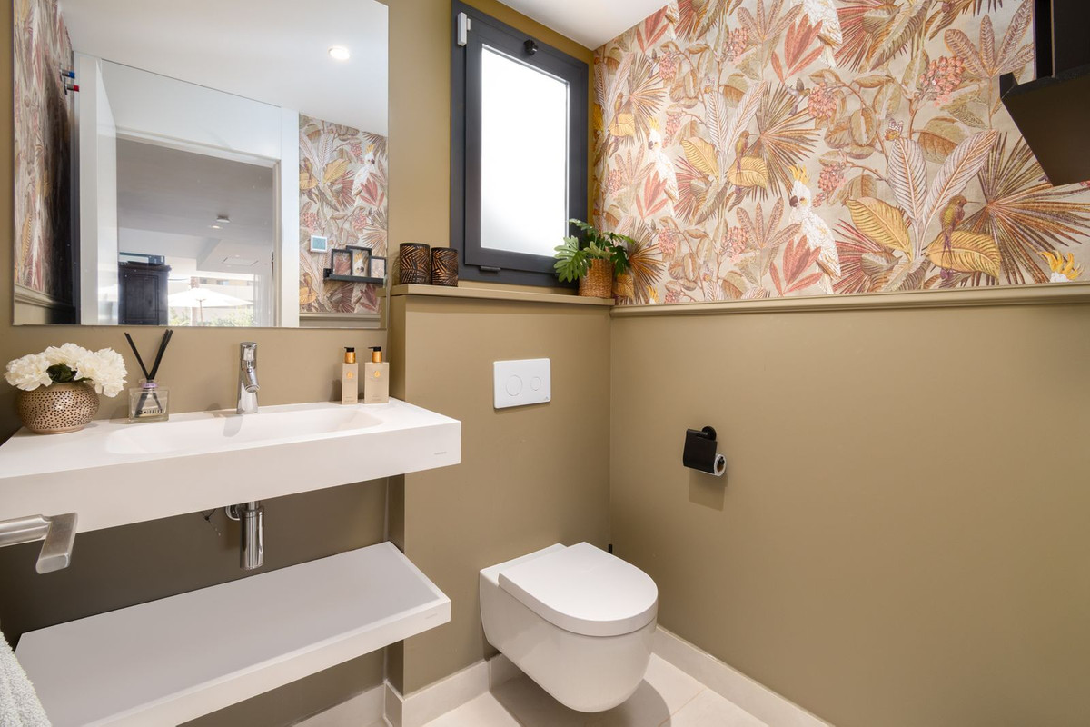 Velkommen til denne enestående luksuslejlighed med 3 soveværelser i stueetagen, beliggende i et sikkert, lukket område i Higuerón West.