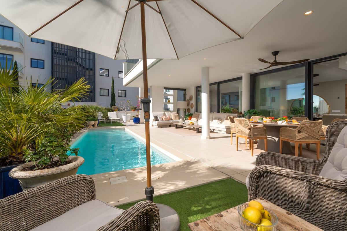 Enestående luksuslejlighed med 3 soveværelser i stueetagen, privat opvarmet pool, store og solrige terrasser, gulvvarme, 2 garagepladser og opbevaring