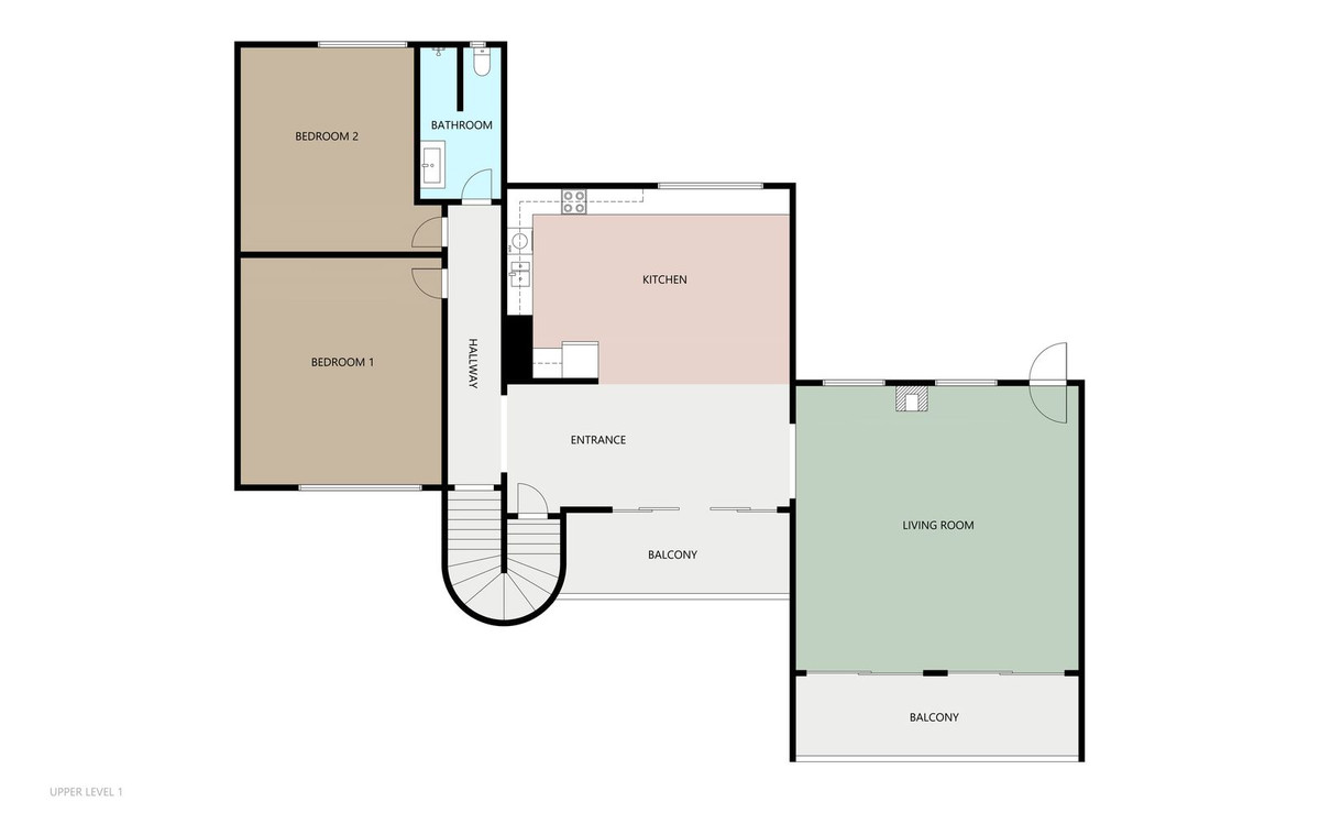 Above the restaurant is a bright two-bedroom apartment, suitable for private use, staff accommodation, or rental. It features a bathroom, fully equipped kitchen, two balconies, a private entrance, and direct internal access to the restaurant for flexibility.