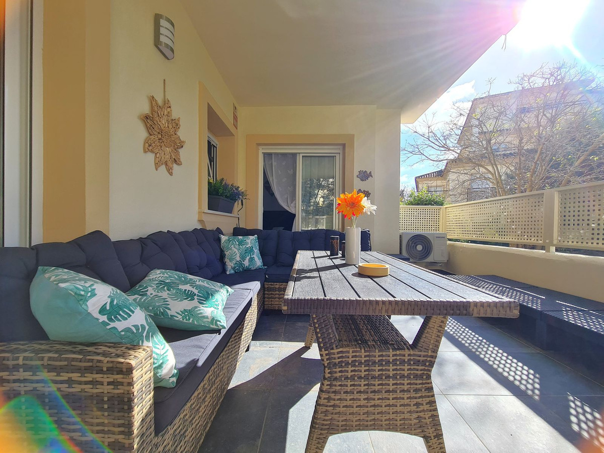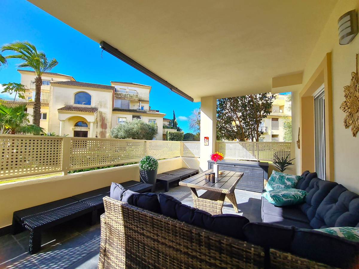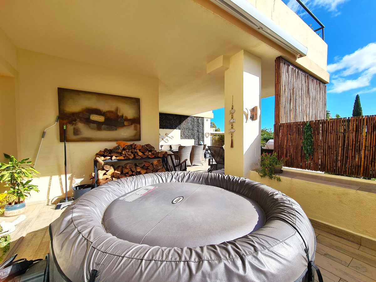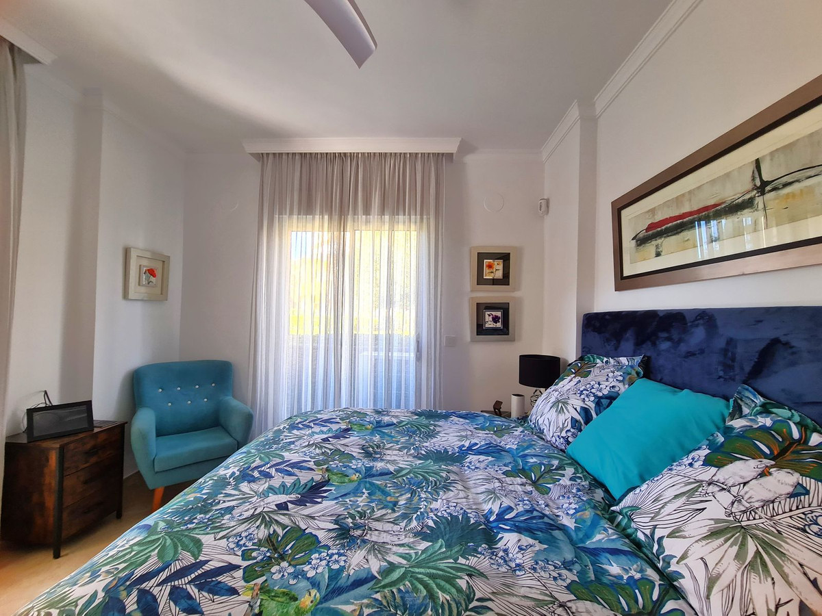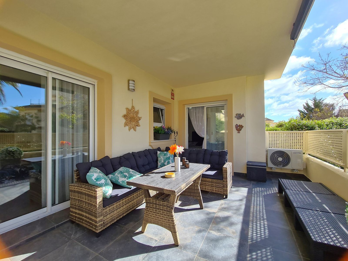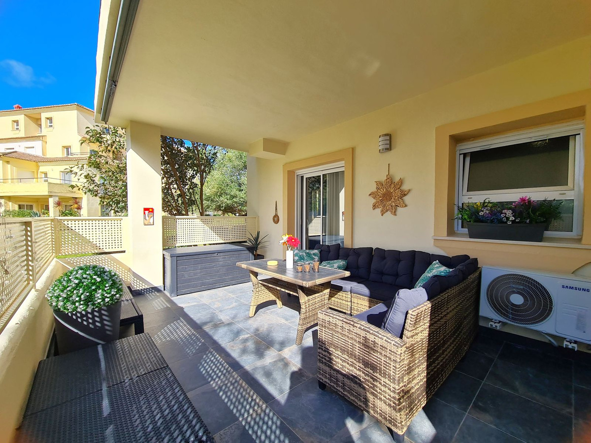 Beliggende i et fremragende boligkompleks kun få minutters kørsel fra Sotogrande Marina og Alcaidesa Strand. Tæt på supermarkeder, restauranter og butikker. Kun 16 km fra Gibraltar og lufthavnen og 95 minutters kørsel fra Malaga Lufthavn. Denne lejlighed i stueetagen har en rummelig entré, der fører til den lyse og luftige stue-spisestue med pejs og direkte adgang til den store, delvist overdækkede private terrasse og have. Det store, fuldt udstyrede køkken kan prale af nye apparater, moderne finish og en funktionel indretning, herunder et separat bryggers og et rummeligt spisekammer. Gangen fører til gæstetoilettet og de tre store soveværelser, alle udstyret med indbyggede skabe, aircondition, adgang til en anden terrasse og ensuite badeværelser. Alle soveværelser har vinduer, der giver rigeligt naturligt lys og ventilation. Ejendommen kan prale af bekvemmeligheden af to underjordiske parkeringspladser, to golfvognspladser og to opbevaringsenheder. Det lukkede område har 24-timers sikkerhed, fælles swimmingpools og haver samt et nyrenoveret klubhus. En fremvisning anbefales på det kraftigste!