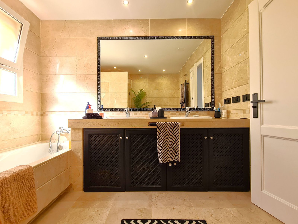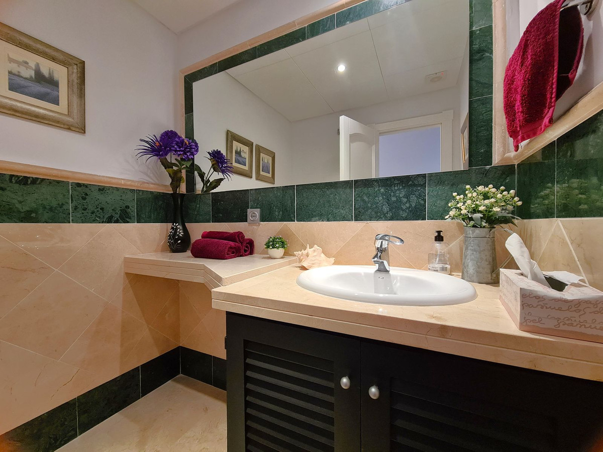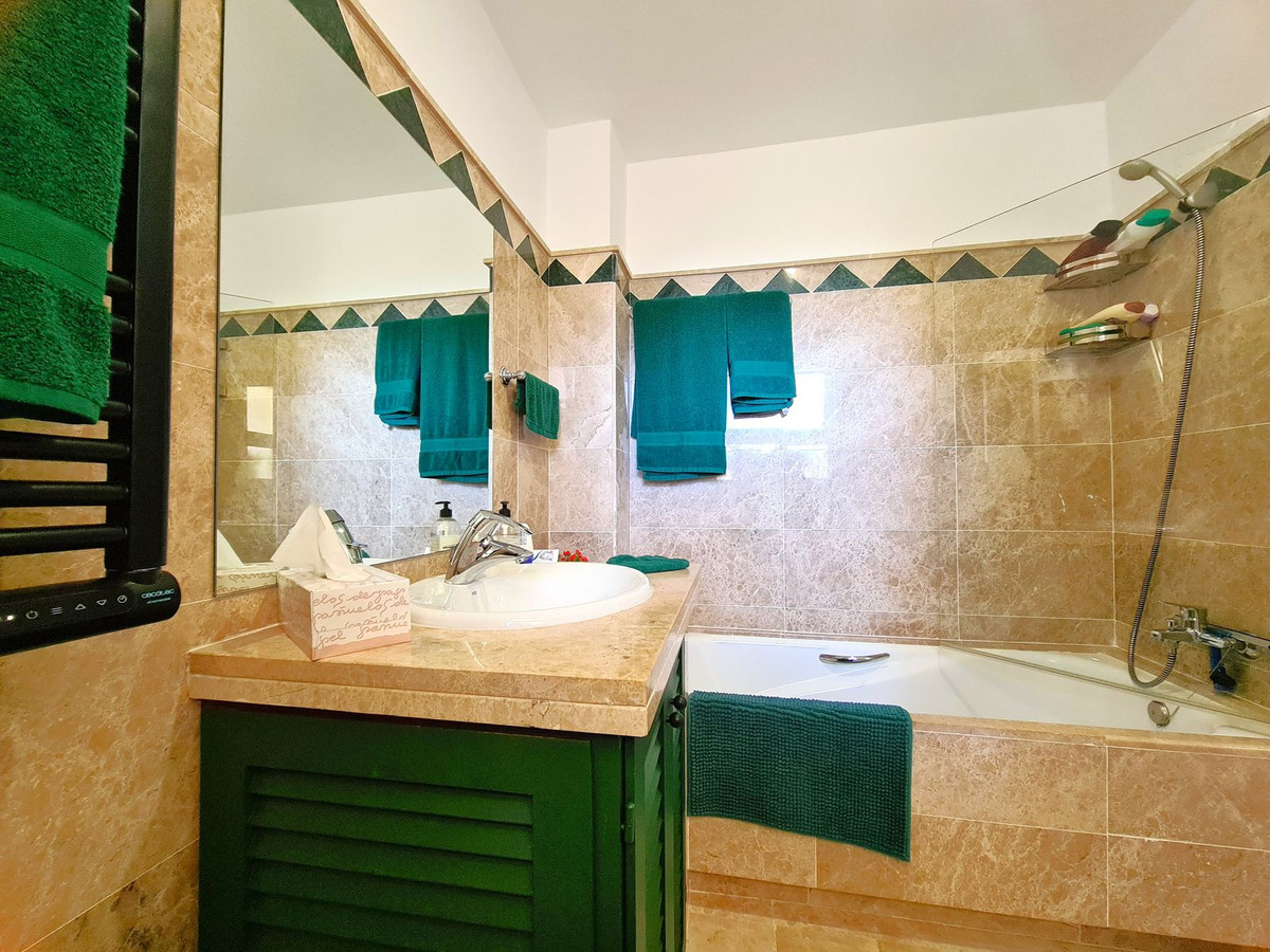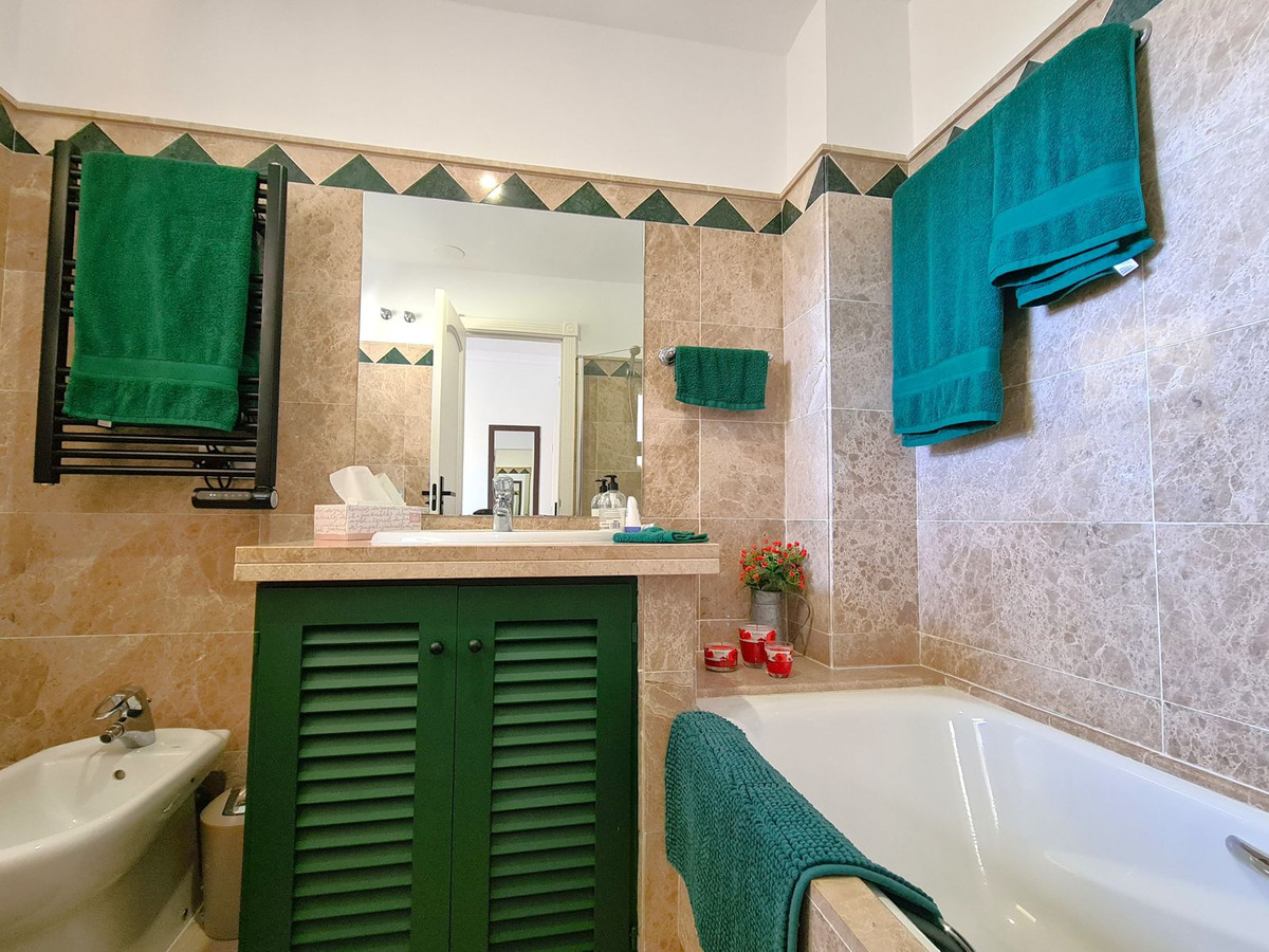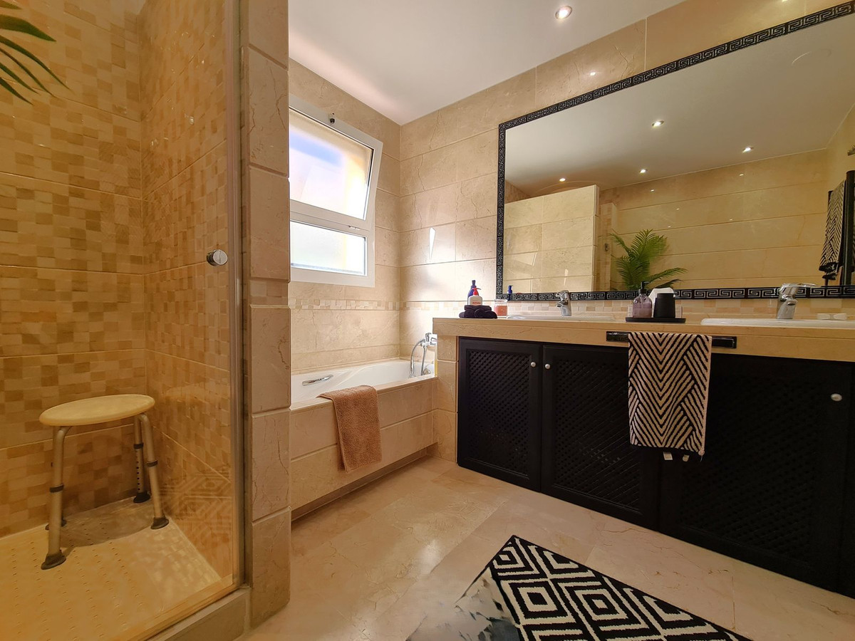 Beliggende i et fremragende boligkompleks kun få minutters kørsel fra Sotogrande Marina og Alcaidesa Strand. Tæt på supermarkeder, restauranter og butikker. Kun 16 km fra Gibraltar og lufthavnen og 95 minutters kørsel fra Malaga Lufthavn. Denne lejlighed i stueetagen har en rummelig entré, der fører til den lyse og luftige stue-spisestue med pejs og direkte adgang til den store, delvist overdækkede private terrasse og have. Det store, fuldt udstyrede køkken kan prale af nye apparater, moderne finish og en funktionel indretning, herunder et separat bryggers og et rummeligt spisekammer. Gangen fører til gæstetoilettet og de tre store soveværelser, alle udstyret med indbyggede skabe, aircondition, adgang til en anden terrasse og ensuite badeværelser. Alle soveværelser har vinduer, der giver rigeligt naturligt lys og ventilation. Ejendommen kan prale af bekvemmeligheden af to underjordiske parkeringspladser, to golfvognspladser og to opbevaringsenheder. Det lukkede område har 24-timers sikkerhed, fælles swimmingpools og haver samt et nyrenoveret klubhus. En fremvisning anbefales på det kraftigste!