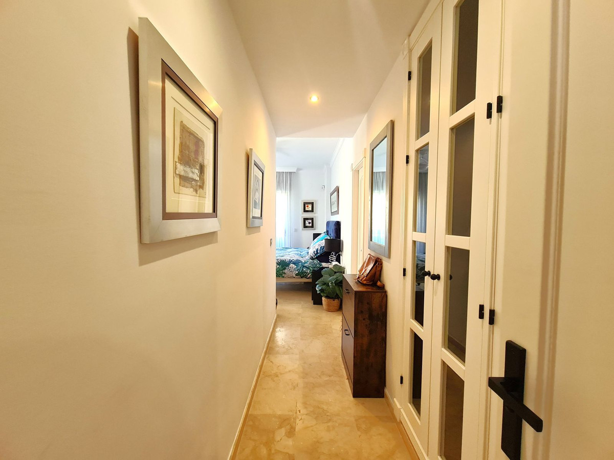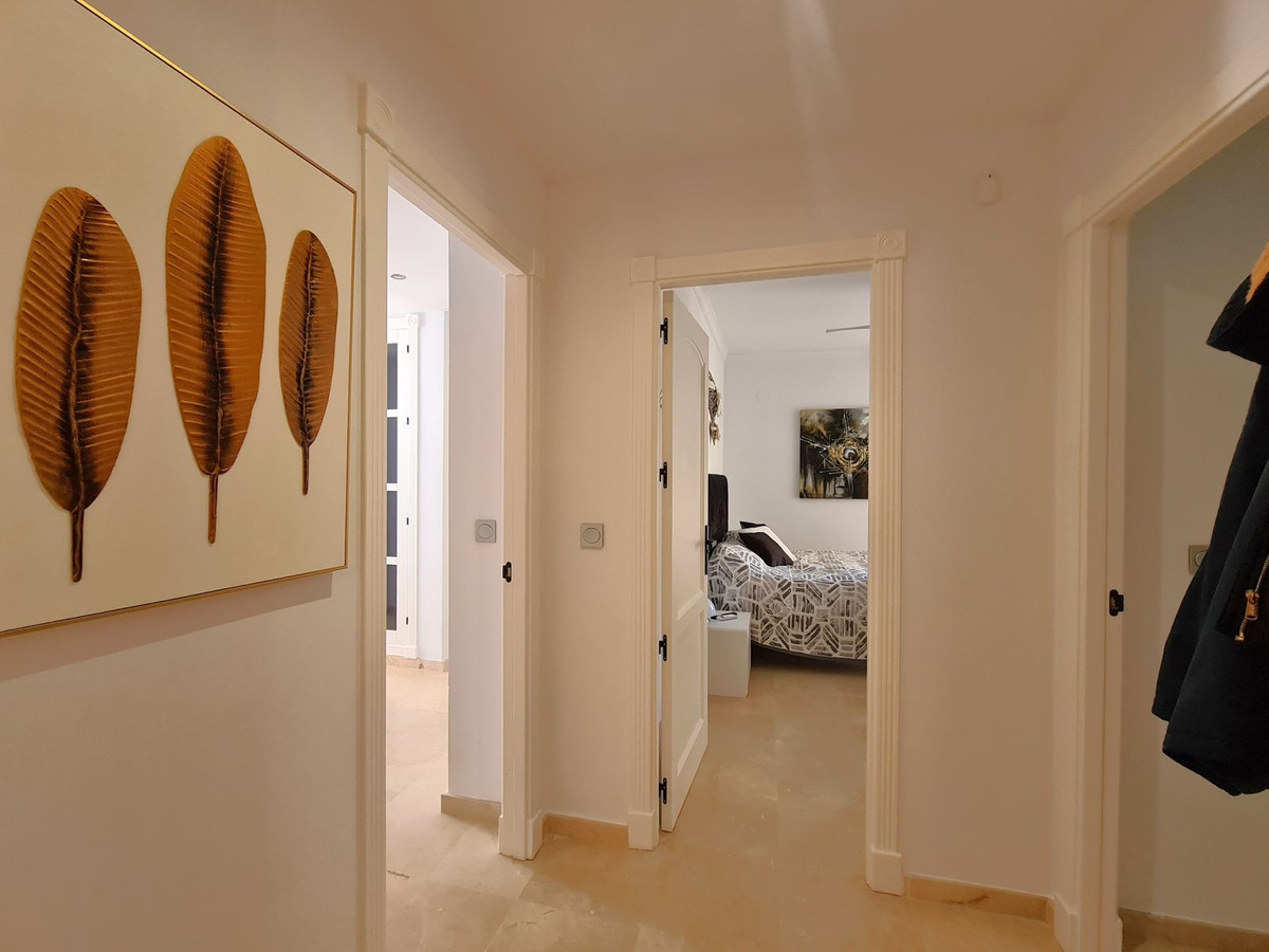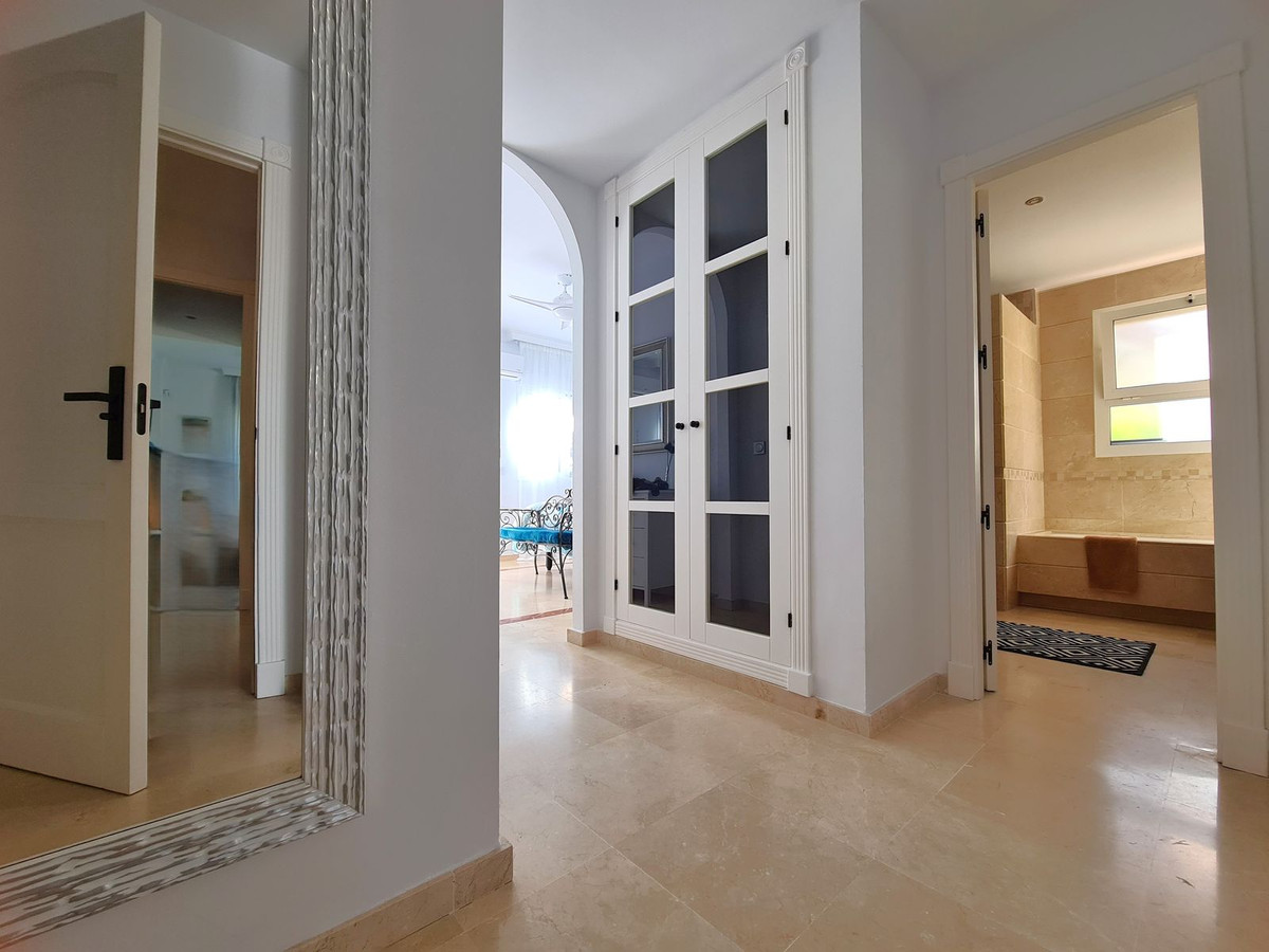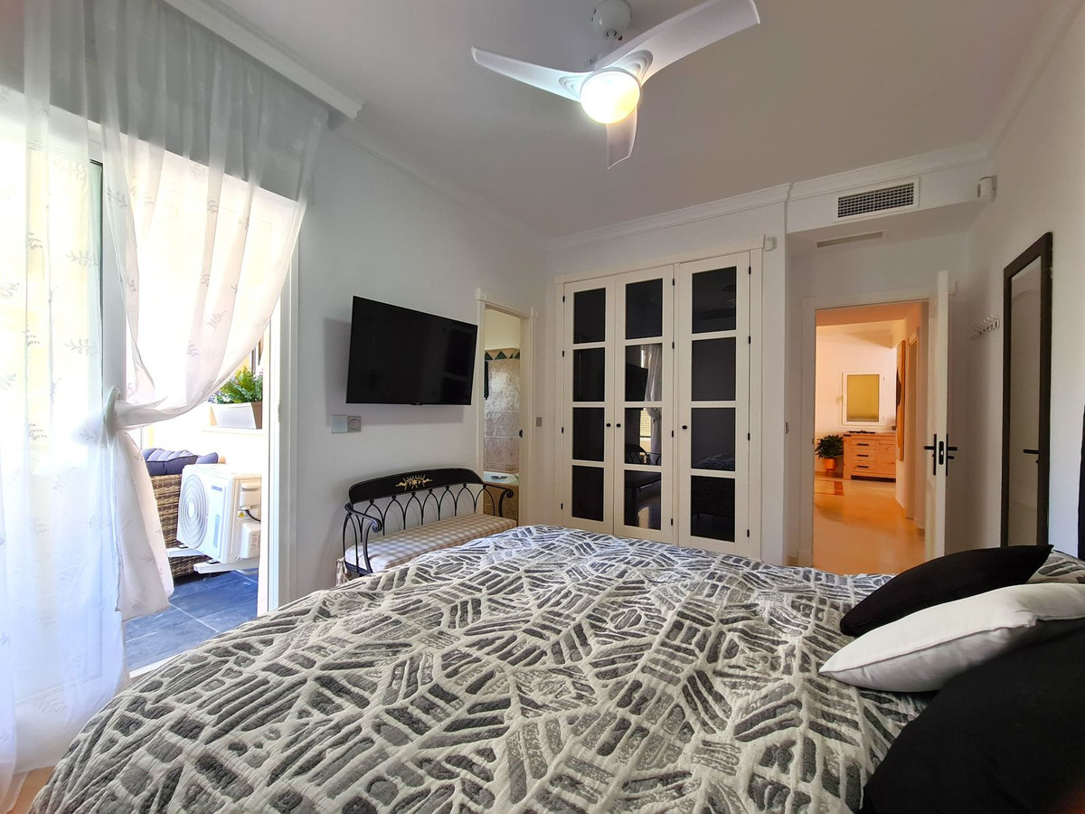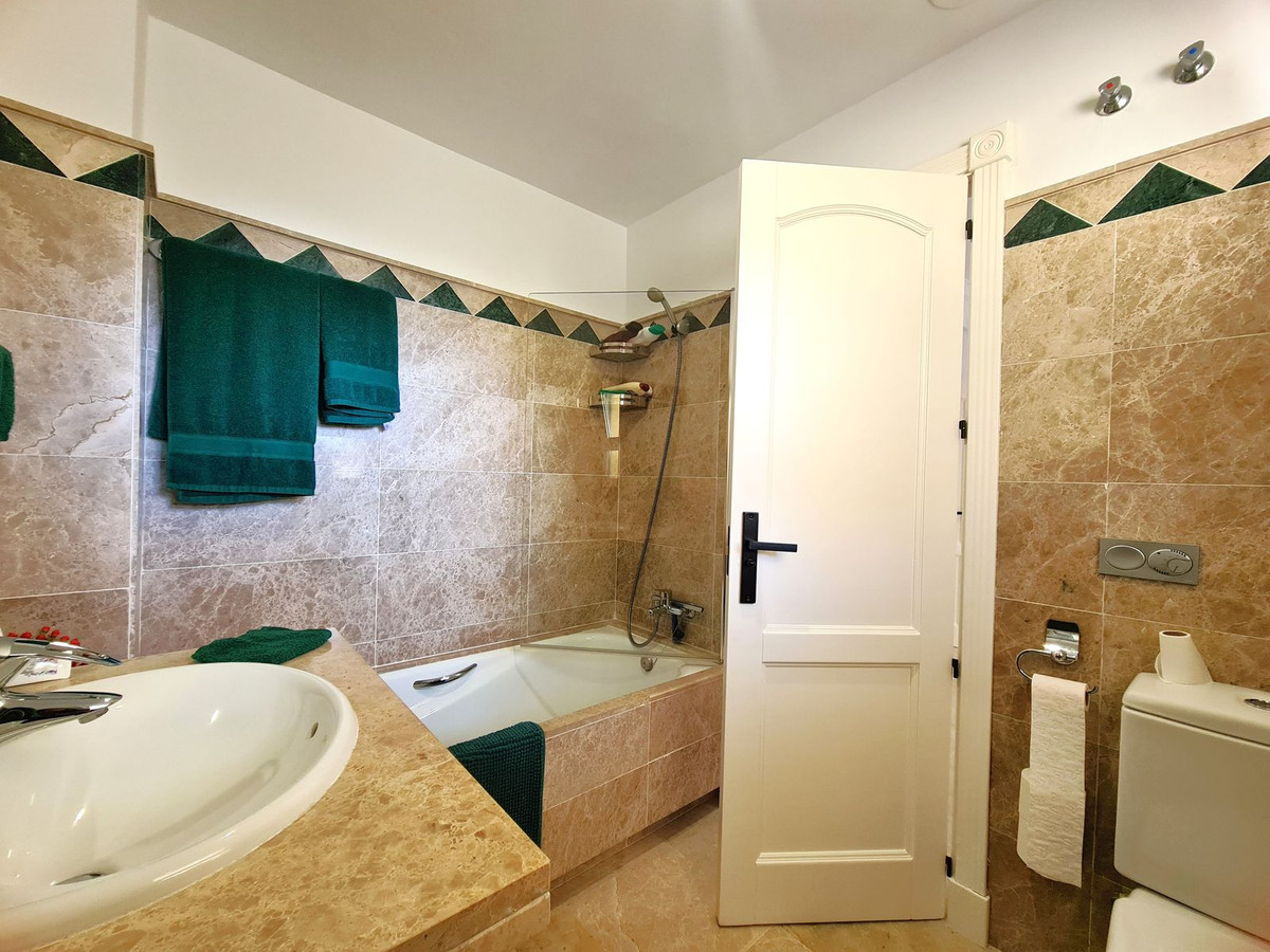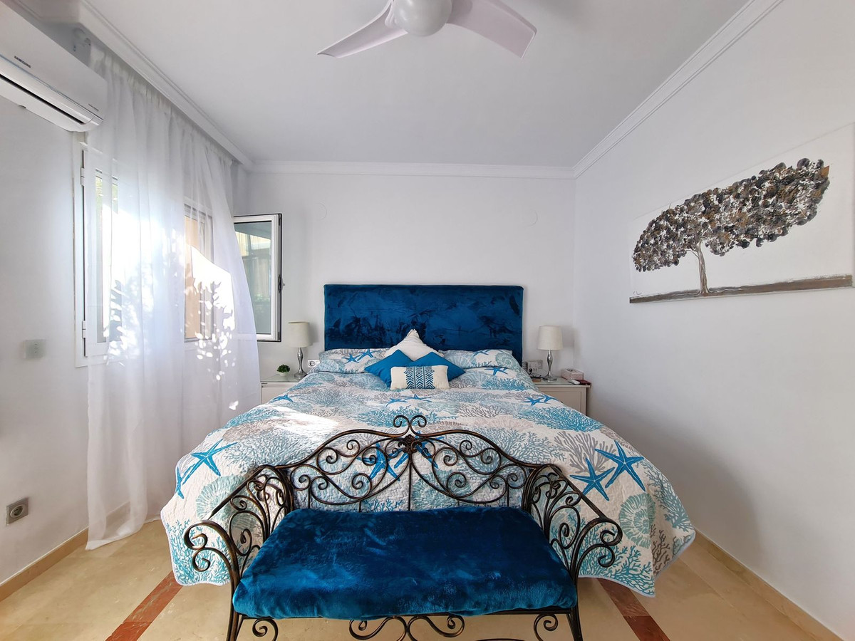 Beliggende i et fremragende boligkompleks kun få minutters kørsel fra Sotogrande Marina og Alcaidesa Strand. Tæt på supermarkeder, restauranter og butikker. Kun 16 km fra Gibraltar og lufthavnen og 95 minutters kørsel fra Malaga Lufthavn. Denne lejlighed i stueetagen har en rummelig entré, der fører til den lyse og luftige stue-spisestue med pejs og direkte adgang til den store, delvist overdækkede private terrasse og have. Det store, fuldt udstyrede køkken kan prale af nye apparater, moderne finish og en funktionel indretning, herunder et separat bryggers og et rummeligt spisekammer. Gangen fører til gæstetoilettet og de tre store soveværelser, alle udstyret med indbyggede skabe, aircondition, adgang til en anden terrasse og ensuite badeværelser. Alle soveværelser har vinduer, der giver rigeligt naturligt lys og ventilation. Ejendommen kan prale af bekvemmeligheden af to underjordiske parkeringspladser, to golfvognspladser og to opbevaringsenheder. Det lukkede område har 24-timers sikkerhed, fælles swimmingpools og haver samt et nyrenoveret klubhus. En fremvisning anbefales på det kraftigste!