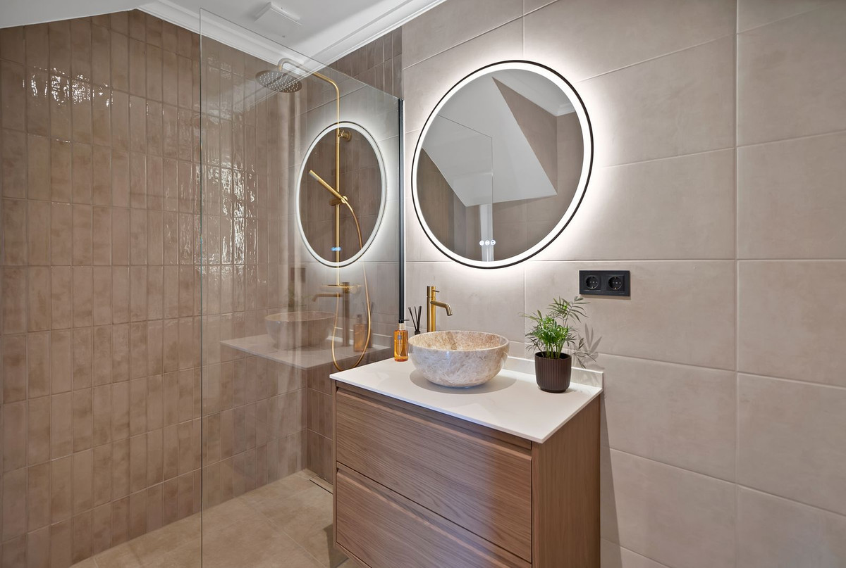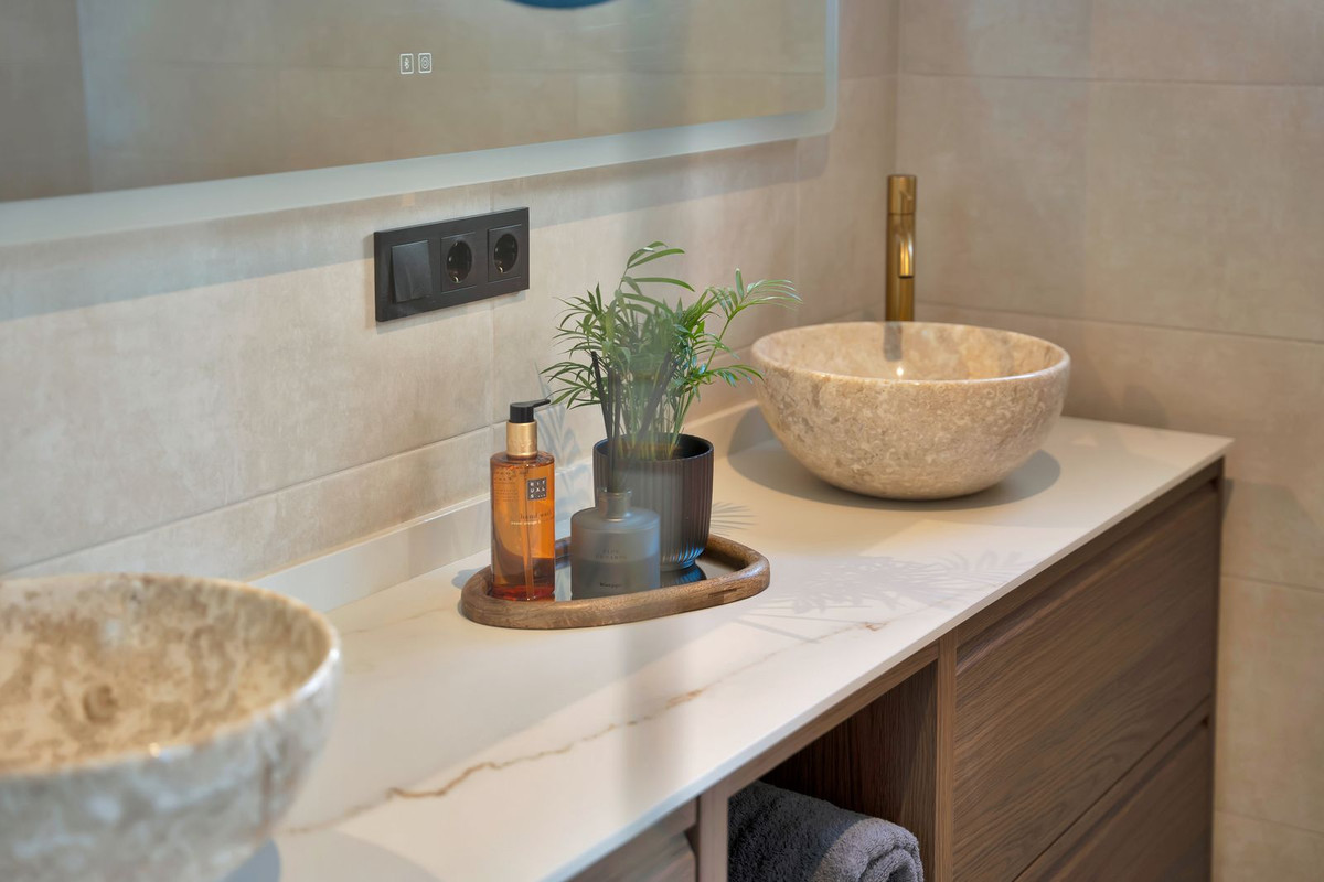 Den nederste etage åbner direkte ud til den private have, hvor der findes jacuzzi og solsenge – et ideelt sted at slappe af og nyde livsstilen på Costa del Sol.