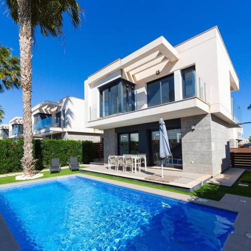 Welcome to this stunning contemporary villa located in the highly sought-after Vistabella Golf community. Set on a generous 324m² plot, this beautifully presented 3-bedroom, 2-bathroom home offers 127m² of stylish living space, designed to maximise light, comfort, and seamless indoor-outdoor living.