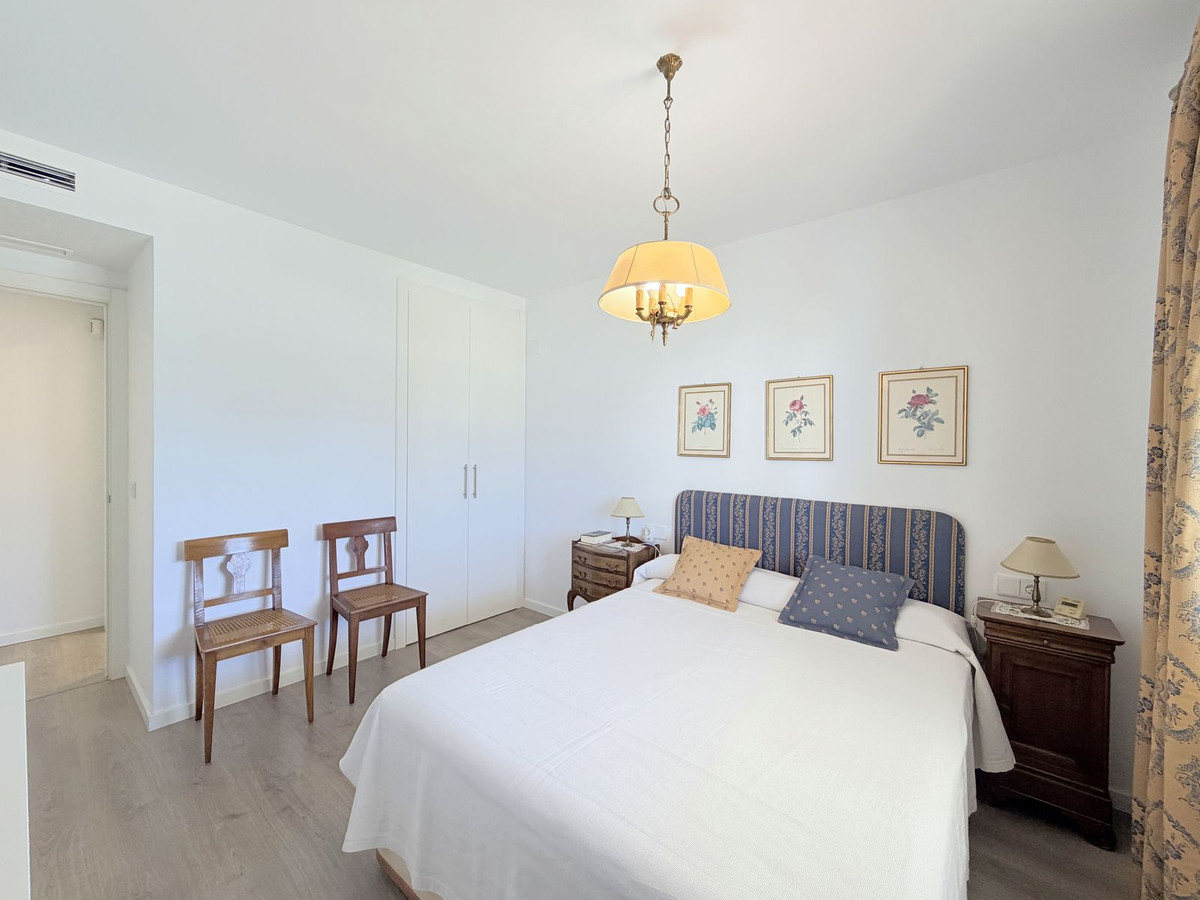 Fantastic ground-floor apartment with a large private garden and open views of the sea and mountains, located in Estepona, in a contemporary residential complex completed in 2021, just 5 minutes by car from the town center and 15 minutes from Sotogrande. The development, with modern design and clean lines, features a swimming pool and well-maintained green areas, creating a pleasant and highly valued environment. The property is in excellent condition, with high-quality renovations and finishes throughout. The open-plan living area combines lounge, dining space, and fully equipped kitchen with custom storage solutions. From here, you can access a spacious covered terrace, ideal for year-round enjoyment. Other upgrades include motorized blinds with a security locking system. The private garden adds a highly desirable extra, providing space, privacy, and multiple possibilities to create different outdoor areas. The master suite features a dressing area, direct access to the porch, and a fully renovated bathroom. A parking space and storage room are included, adding practicality and convenience. An ideal opportunity for those looking for a modern, comfortable home ready to move into, perfect as a permanent residence or a second home on the Costa del Sol.