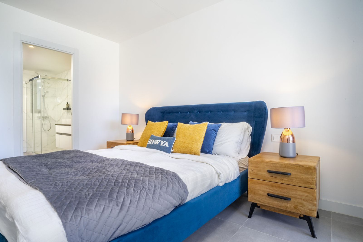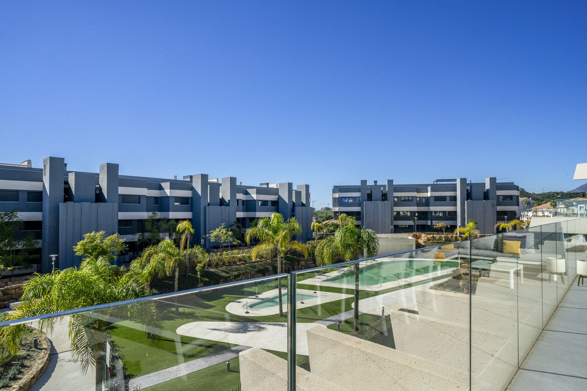 The apartment enjoys a privileged south-facing orientation, allowing natural light to flood the interior throughout the day. The spacious open-plan living and dining area connects seamlessly with a generous 27.83 m² terrace, creating a harmonious indoor-outdoor living experience. From here, you enjoy open views over the beautifully landscaped gardens and communal pool area, as well as a subtle glimpse of the Mediterranean.