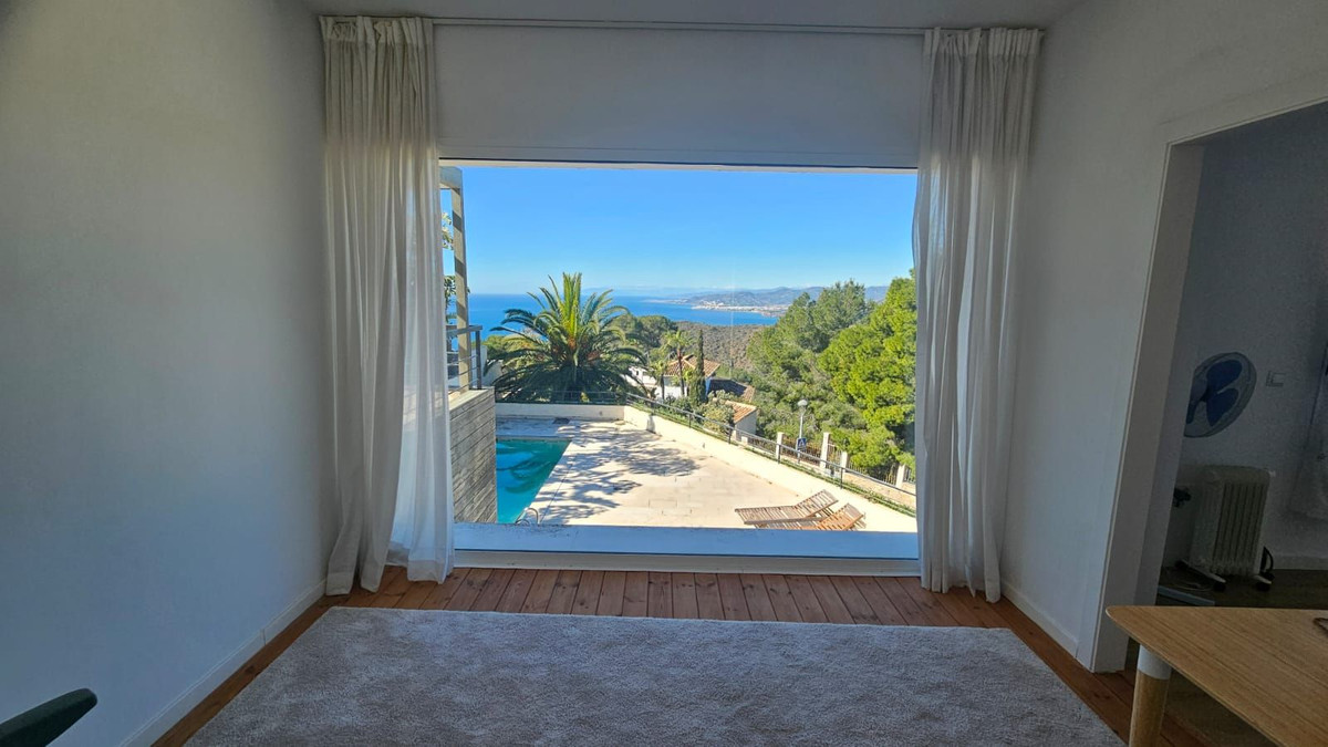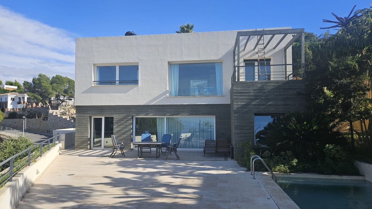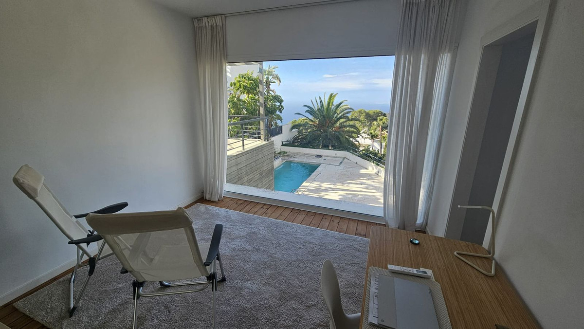 Outside, the villa truly shines. Multiple terraces provide sun-drenched relaxation areas, al fresco dining spaces, and uninterrupted views across the coastline. The private swimming pool is perfectly positioned to enjoy the scenery — an idyllic setting for long summer days.