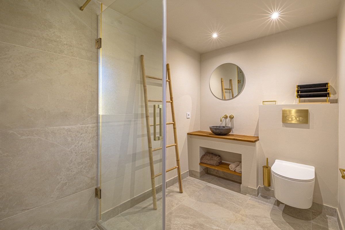 Both bedrooms feature en-suite bathrooms, complemented by a separate guest toilet, providing comfort and privacy for residents and visitors alike. The interior flows seamlessly onto a spectacular 61m² west-facing terrace, ideal for outdoor dining, entertaining, or simply enjoying the afternoon sun and evening sunsets.
