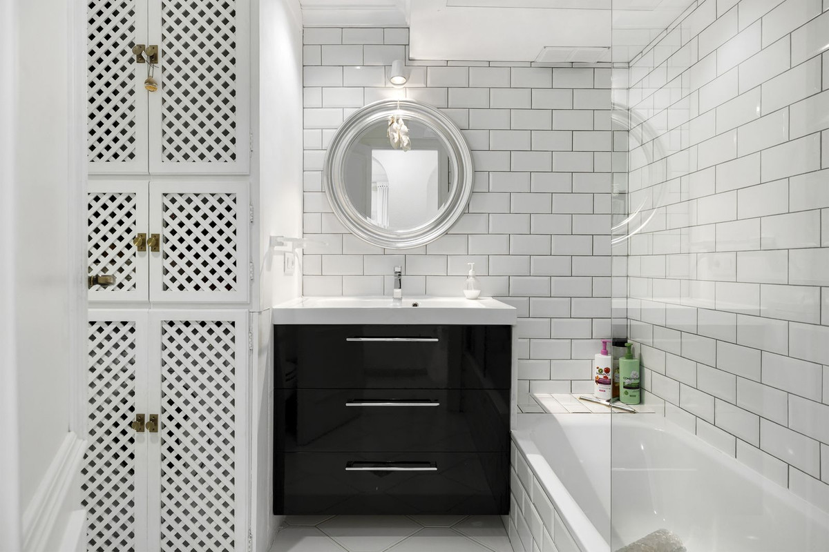 The apartment has two spacious bedrooms. The bathroom is located between the two bedrooms.